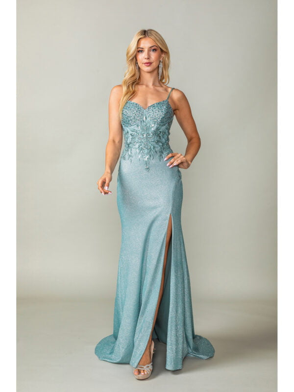 Step into elegance with the Dancing Queen 4375 evening gown, a show-stopping piece designed to dazzle. This fitted dress features a structured bodice with a deep V-neckline and delicate spaghetti straps that offer subtle support and grace. The gown is crafted from a stretch fabric that hugs your figure beautifully, accentuating your curves in all the right places. A thigh-high slit adds a touch of drama and movement, while the shimmering finish ensures you shine under any light. Perfect for prom, pageants, formal galas, or any evening affair where you want to make a lasting impression.