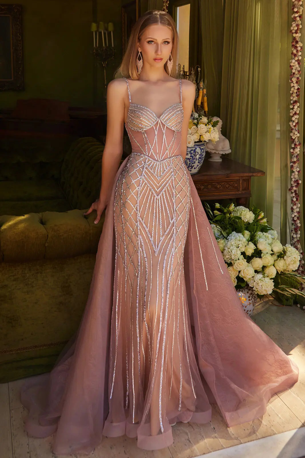 Romantic and intricately detailed, the GL3617 features a flowing A-line silhouette adorned with bejeweled trim forming elegant line patterns throughout. The V-neck bodice is supported by spaghetti straps embellished with delicate jewels, adding a touch of sparkle. A fitted sheer mesh bodice with a zipper back flows into a layered skirt, combining a jewel-accented mesh overskirt with a lace underlayer that subtly peeks through. The look is completed with a structured hem for added shape and movement. Available in a soft, feminine Mauve.