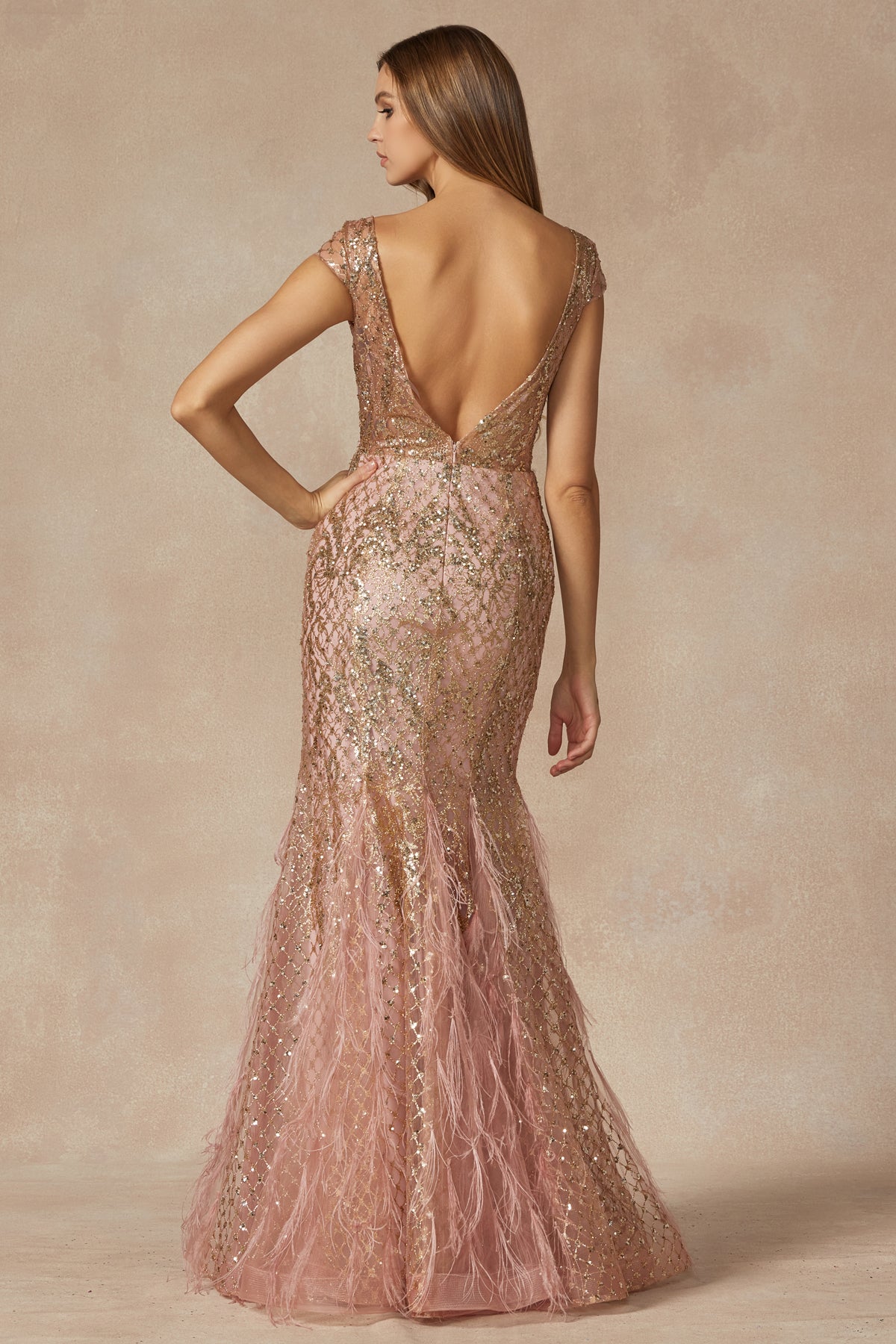 The Juliet 286 evening gown is designed to dazzle at any formal event. It features a plunging V-neckline with an illusion inset and sheer cap sleeves, creating an elegant and modern silhouette. The bodice is fitted and structured, flowing into a long mermaid skirt that hugs the hips before flaring out. At the bottom of the skirt, soft feathered accents cascade for added texture and movement. The back is open, secured with a zipper closure, and the dress is fully lined with built-in bra cups for support and comfort. The shimmering finish of the fabric ensures that it catches light beautifully as you move.