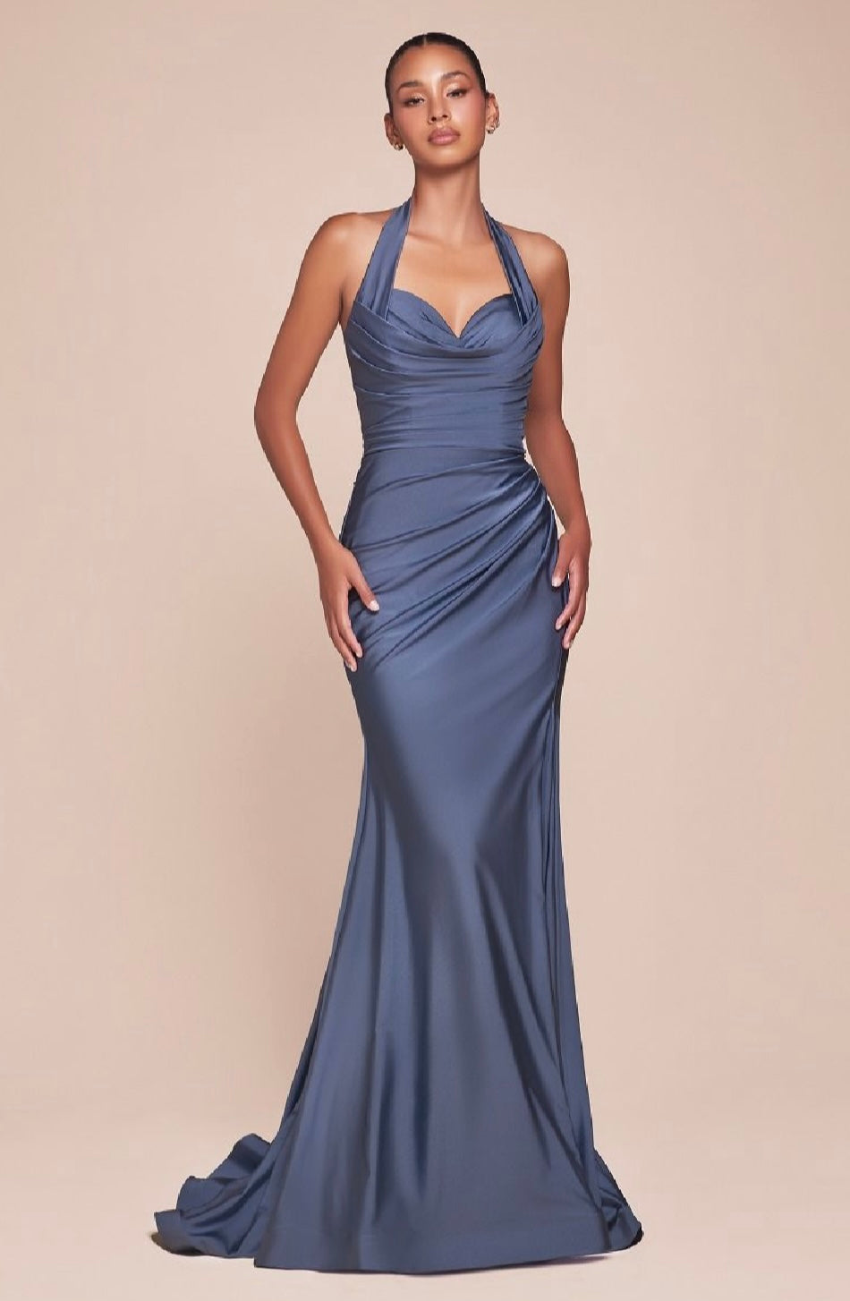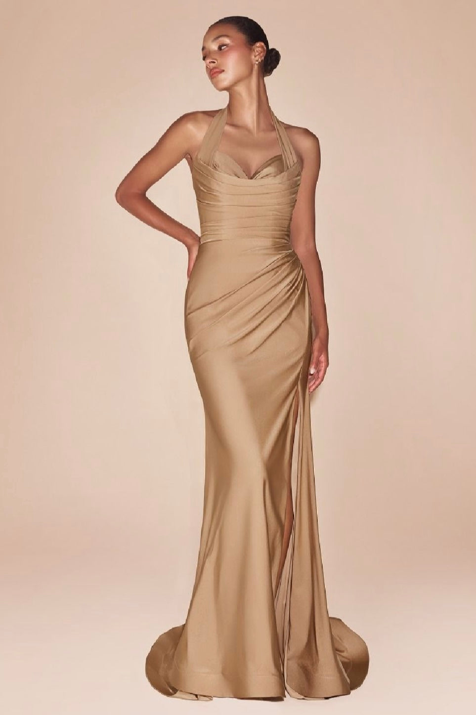 - Design: Halter - sweetheart neckline, gathered waistline, leg slit