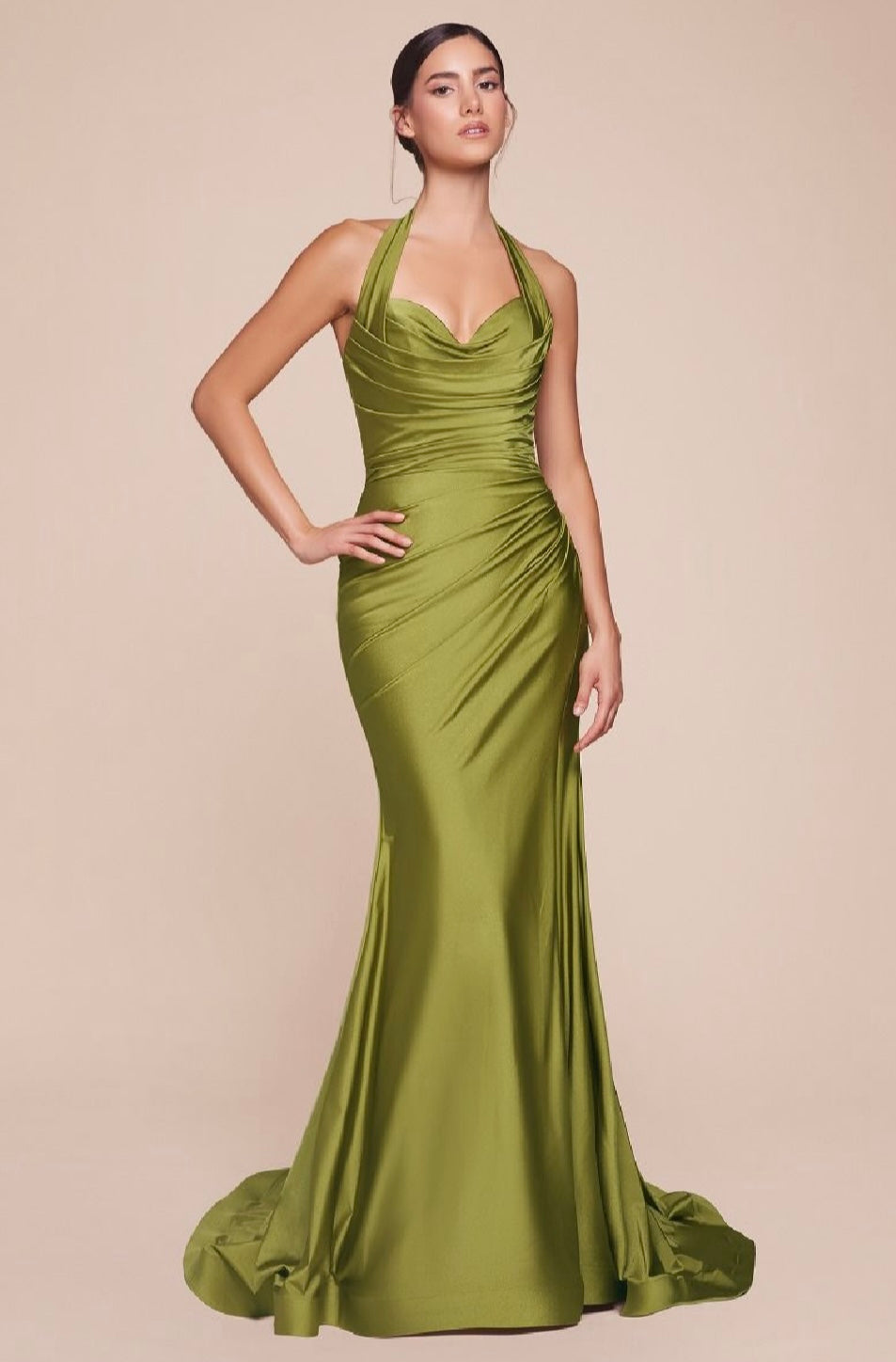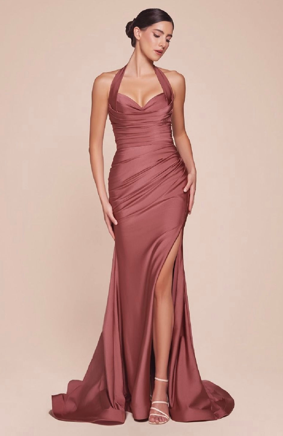Elevate your elegance with this fitted stretch satin dress, featuring a halter sweetheart neckline and a gathered waistline. The design is enhanced by a sophisticated leg slit, providing a touch of allure and ease of movement. Perfect for bridesmaids or formal events, this dress ensures a flattering and graceful silhouette for any special occasion.