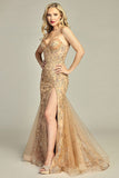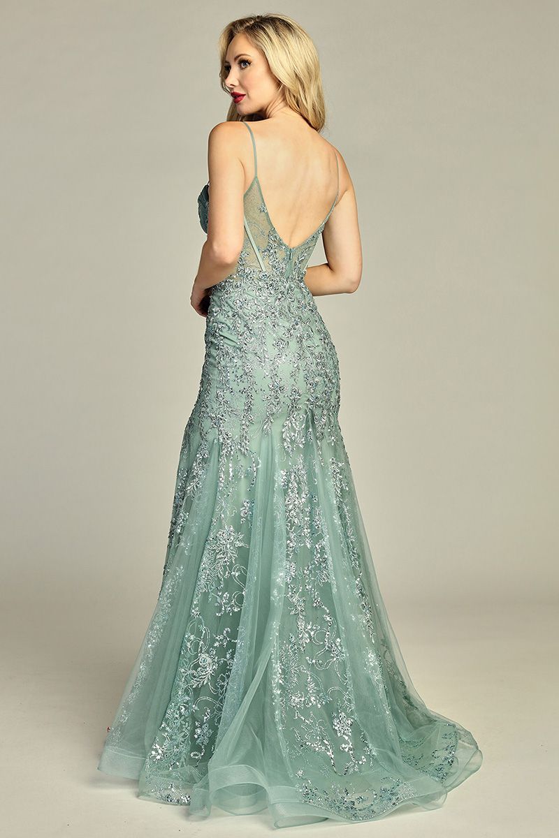 Make an unforgettable entrance in Let Dresses style 7921. This enchanting sage green gown features a structured bustier-style bodice with sheer mesh inserts and intricate floral embroidery. The fitted silhouette enhances your curves, while the high leg slit adds a touch of allure. Finished with delicate straps and a flowing tulle overlay, this gown is perfect for prom, evening galas, or any red-carpet-worthy occasion.