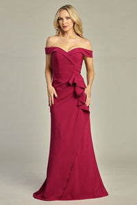 Exude timeless elegance in this off-the-shoulder gown by Let’s, style 7985. Crafted in a rich wine hue, this figure-flattering dress features a structured neckline and a fitted bodice that transitions into a gracefully draped skirt. A cascading ruffle detail at the waist adds a touch of drama and sophistication, enhancing its feminine silhouette. Ideal for formal occasions, evening events, or weddings, this gown is a perfect blend of classic style and modern flair.