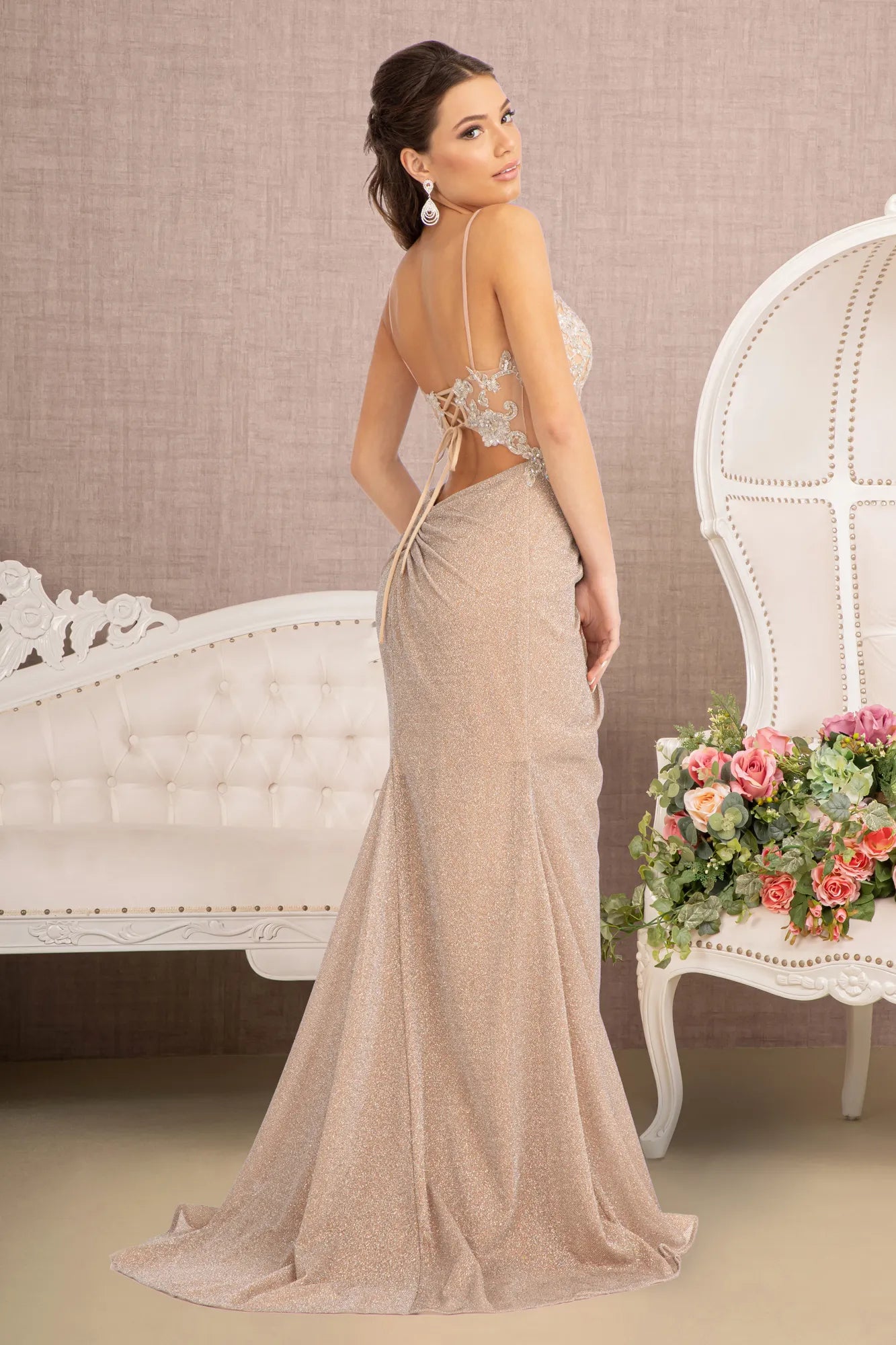 A gorgeous mermaid gown showcasing intricate embroidery, dazzling sequins, and delicate beadwork over a sheer bodice. Designed with a ruched waistline and gathered back hem for a flattering fit. The open cut-out lace-up back and side leg slit add a glamorous touch, while shimmering glitter adorns the entire dress for an all-over sparkle. Available in Champagne, Lilac, and Rose Gold — perfect for making a grand entrance at any formal occasion.