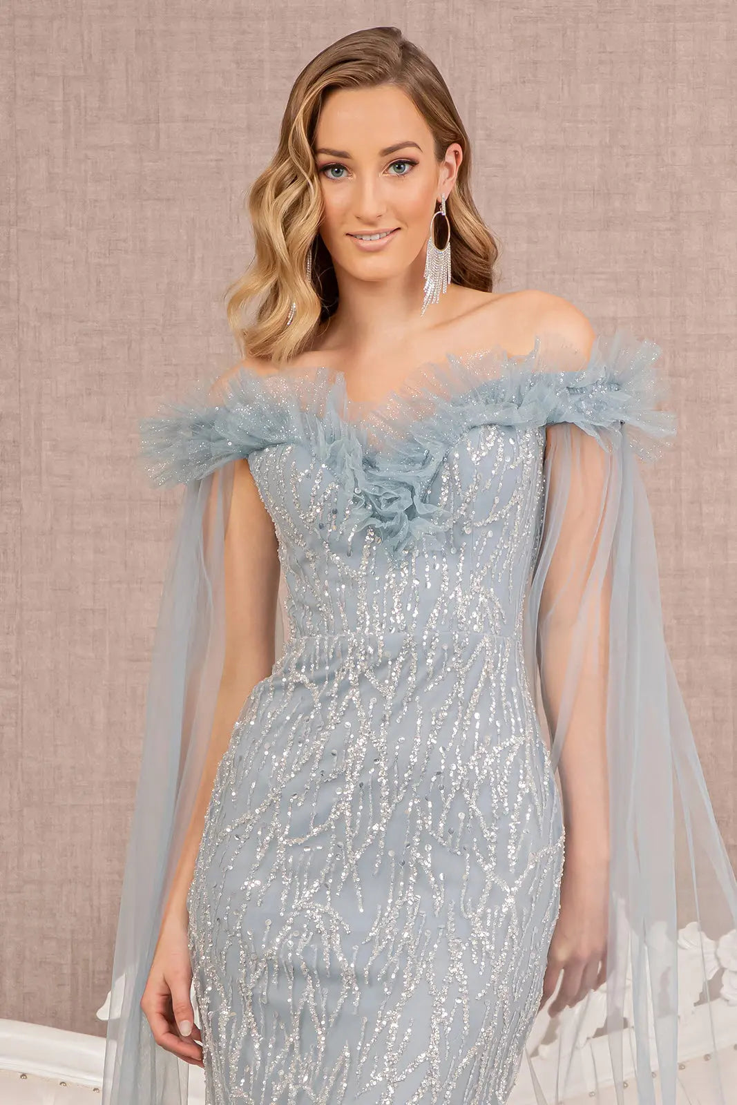 A glamorous strapless mermaid gown crafted from sheer mesh, embellished with sparkling sequins and beads for an all-over shimmering effect. The dress features a unique long mesh layer on the side, adding movement and elegance to the silhouette. Available in a sophisticated Smoky Blue color, perfect for making a stunning entrance at any formal occasion.