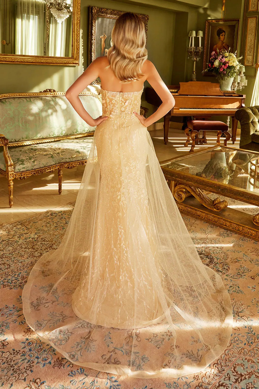 Turn heads in this elegant mermaid-style evening gown, GL3256, available in champagne. Made of soft mesh, it features a sheer jeweled bodice, strapless sweetheart neckline, and a waist drape that flatters the silhouette. Perfect for proms, galas, and formal events.