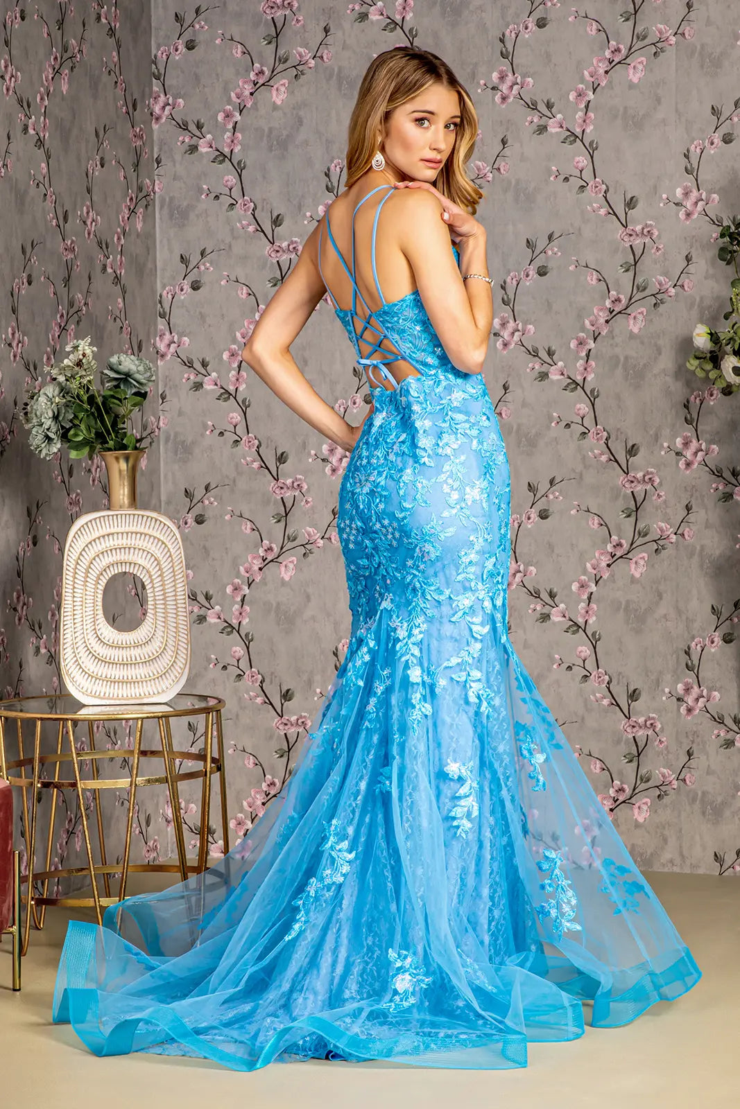 This long gown features a flattering mermaid silhouette that accentuates the figure. It is crafted from mesh fabric adorned with intricate floral embroidery and shimmering sequins, adding a glamorous touch. The bodice is made of sheer mesh with an illusion sweetheart neckline and delicate thin straps. The back features an adjustable lace-up corset with a stylish cut-out detail, providing both elegance and a sensual appeal.