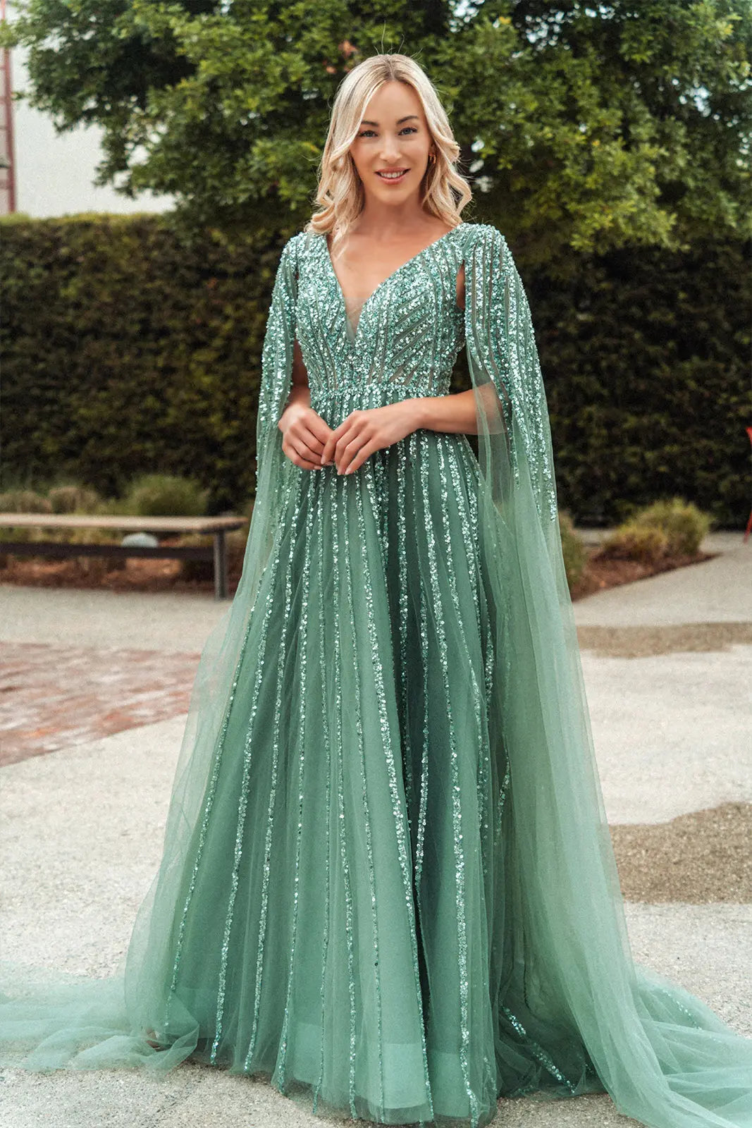 Ethereal and elegant, the GL3494 is a long A-line mesh gown adorned with intricate bead and sequin embellishments that shimmer with every step. The standout feature is its graceful side cape long sleeves, adding movement and drama to this timeless silhouette. Perfect for formal events, galas, or special occasions where sophistication is key. Available in Champagne and Sage.