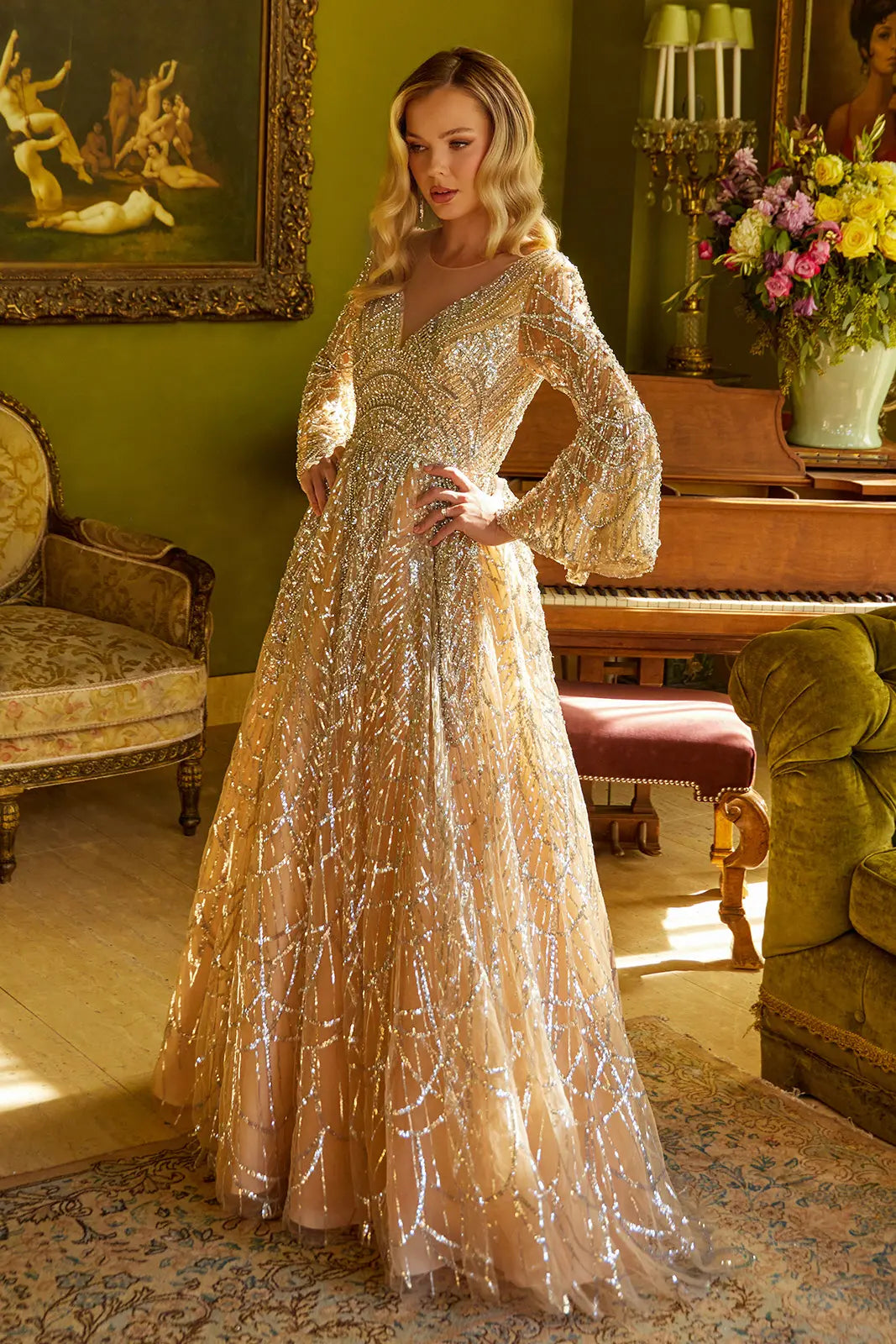 Dazzling and dramatic, the GL3582 gown is a true showstopper. This floor-length A-line dress is extravagantly adorned with jewels, sequins, and beads, creating stunning scale-like patterns throughout the skirt. The fitted bodice features an illusion V-neckline in both the front and back, and is paired with flowing long bell sleeves for a touch of vintage-inspired glamour. Perfect for formal galas, red carpet events, or any moment that calls for head-turning elegance. Available in Champagne.