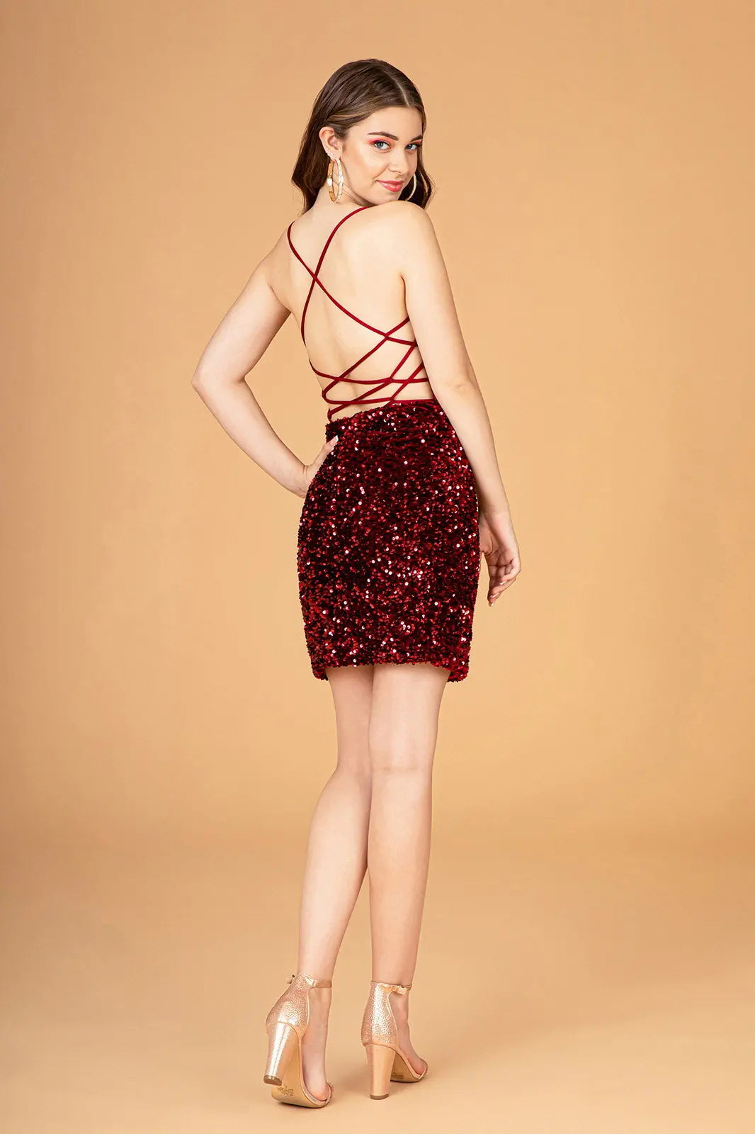 Make a glamorous entrance in this velvet bodycon short dress, designed to dazzle at any special event. Sparkling sequins adorn the dress from bodice to skirt, while the illusion sweetheart neckline and subtle side slit add a playful, chic touch. The wide open back with spaghetti-strapped lace-up closure completes the look with elegance and allure.