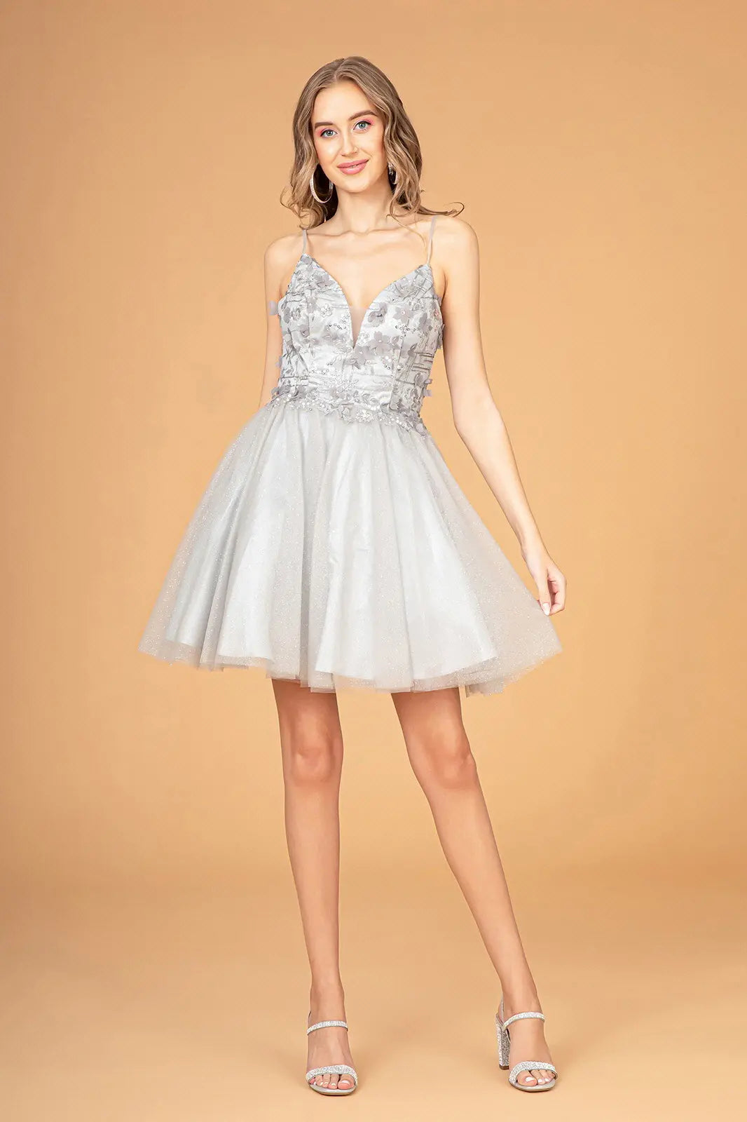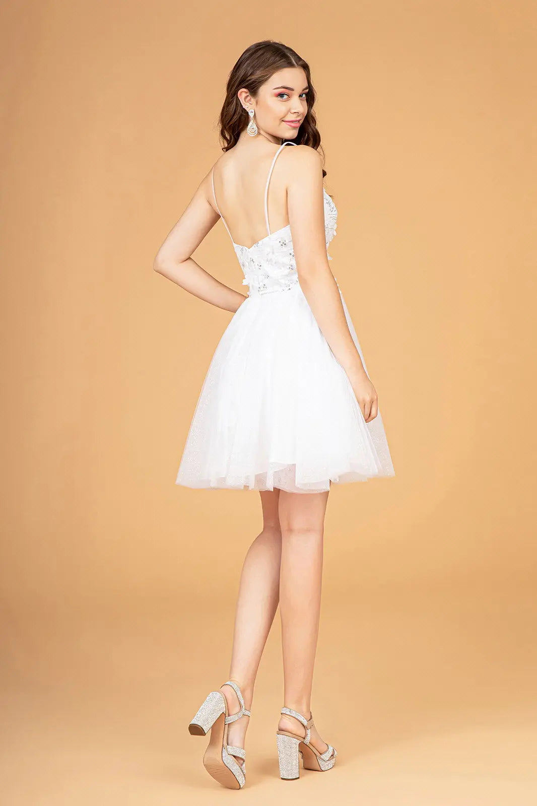 Whimsical and enchanting, this babydoll mesh short dress is adorned with delicate embroidery, shimmering sequins, and glitter for a radiant fairytale look. The 3-D floral appliqués add dimension and charm, while the detachable short mesh cape gives a playful, dreamy touch. Perfect for birthdays, homecoming, quinceañeras, or any special celebration. Available in blush, champagne, silver, and white.