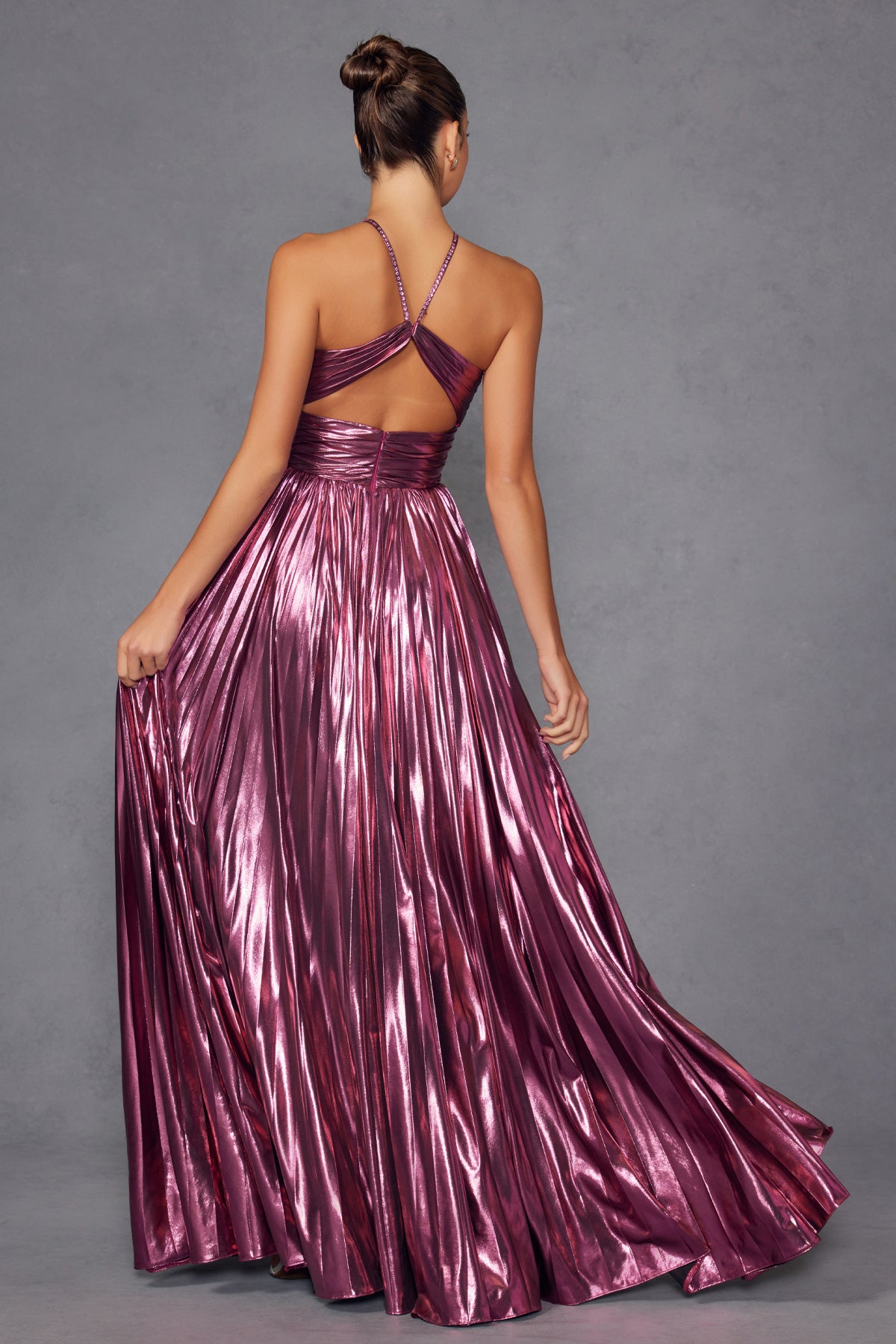 The Juliet Evening Gown JT2503A is a sophisticated halter gown designed to captivate at formal events. It features a sleeveless sweetheart bodice with halter straps and an open back secured with a zipper closure. The floor-length A-line skirt is pleated, flowing gracefully with a sweep train and a front slit that adds movement and allure. Crafted from metallic polyester fabric, the gown includes built-in bra cups and is fully lined for comfort and support.