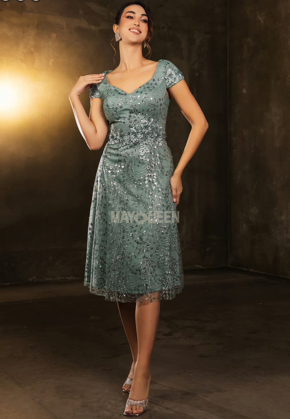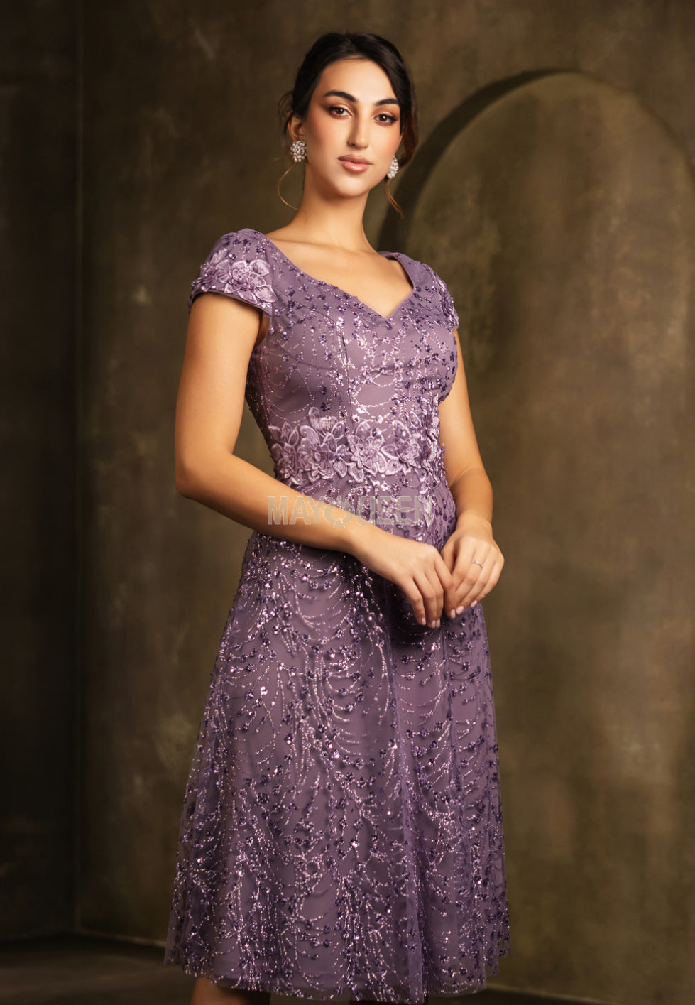 The MayQueen MQ2162 is a captivating tea-length A-line gown that seamlessly blends elegance with contemporary charm. Crafted from soft tulle, this dress features exquisite floral lace appliqués and shimmering sequin embellishments, adding a touch of glamour to its delicate design. The flattering V-neckline and cap sleeves enhance its graceful silhouette, making it an ideal choice for semi-formal occasions. The illusion full back with a discreet zipper closure ensures a seamless fit, while the natural waistline accentuates the figure. This dress is perfect for events such as cocktail parties, garden parties, or as a chic option for mothers of the bride or groom.
