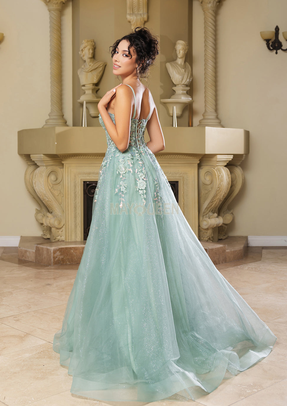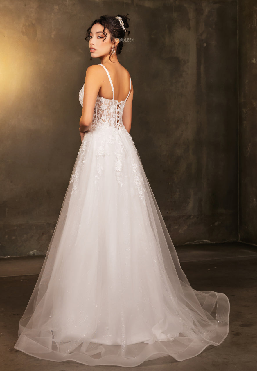 The MayQueen MQ2165 is a captivating A-line gown that seamlessly blends modern elegance with timeless charm. Crafted from luxurious tulle, this gown features a fitted bodice adorned with intricate floral lace appliqué and shimmering beaded accents, creating a delicate and feminine look. The plunging V-neckline, complemented by an illusion inset, adds a contemporary edge, while the spaghetti straps provide support and comfort.The gown’s A-line silhouette gracefully flows into a voluminous skirt, highlighted by a layered design that adds depth and movement. The floor-length design is completed with a sweeping train, enhancing the gown’s dramatic effect. A corset lace-up back with a concealed zipper ensures a secure and flattering fit.This gown is perfect for formal events, proms, or any special occasion where you wish to make a lasting impression.
