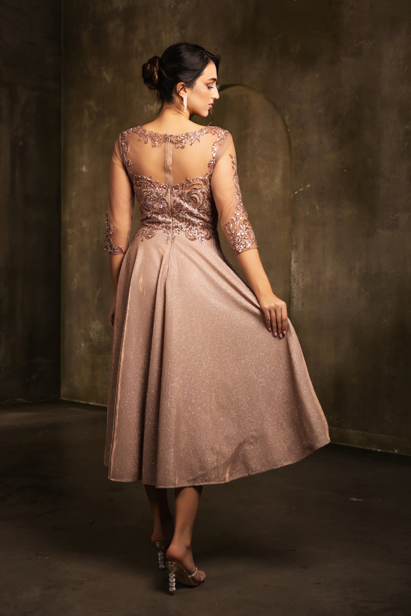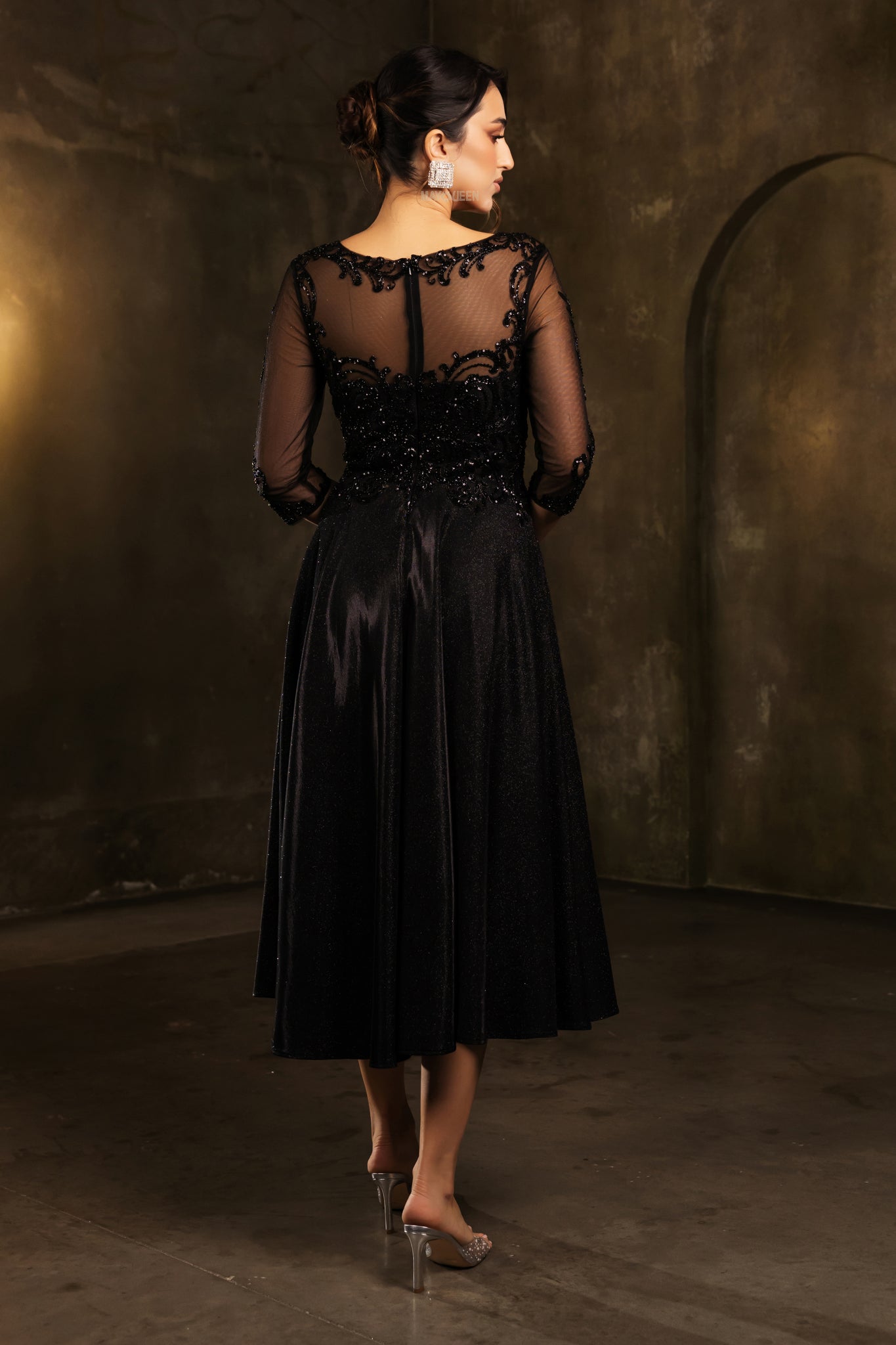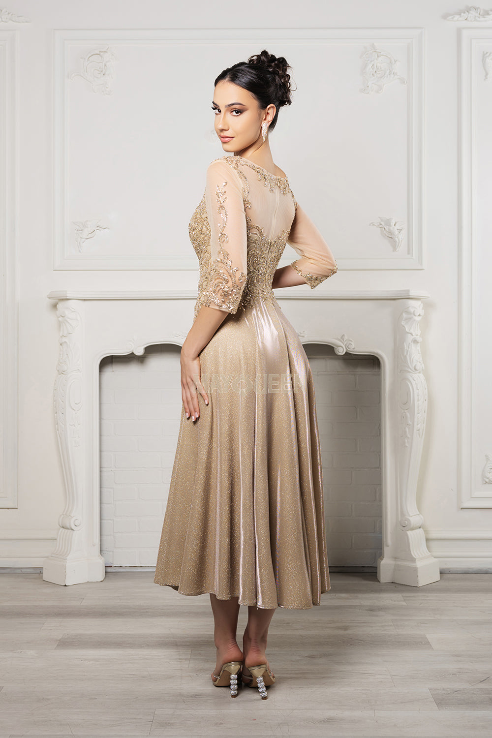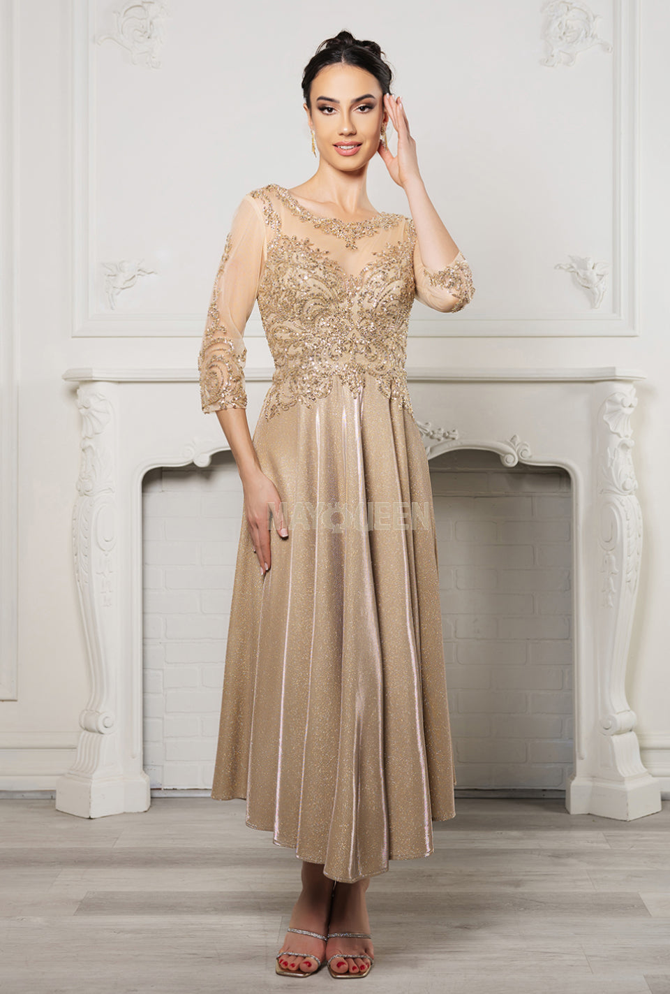 Step into vintage elegance with a modern twist in this enchanting May Queen MQ2124 evening gown. This stunning tea-length design features a lace-appliqué bodice adorned with delicate sequins and embroidery, paired with a refined illusion bateau neckline and sheer quarter-length sleeves that exude sophistication .The illusion back, complete with a discreet zipper closure, adds a graceful finishing touch while ensuring a seamless fit . Crafted from Lycra, the gown offers both comfort and a flattering drape .The glittering A-line skirt cascades into a tasteful tea-length silhouette, making it an ideal choice for formal receptions, mother-of-the-bride or -groom roles, or other memorable occasions .Whether you’re attending an elegant evening affair or a special celebration, the May Queen MQ2124 promises timeless charm and refined allure.