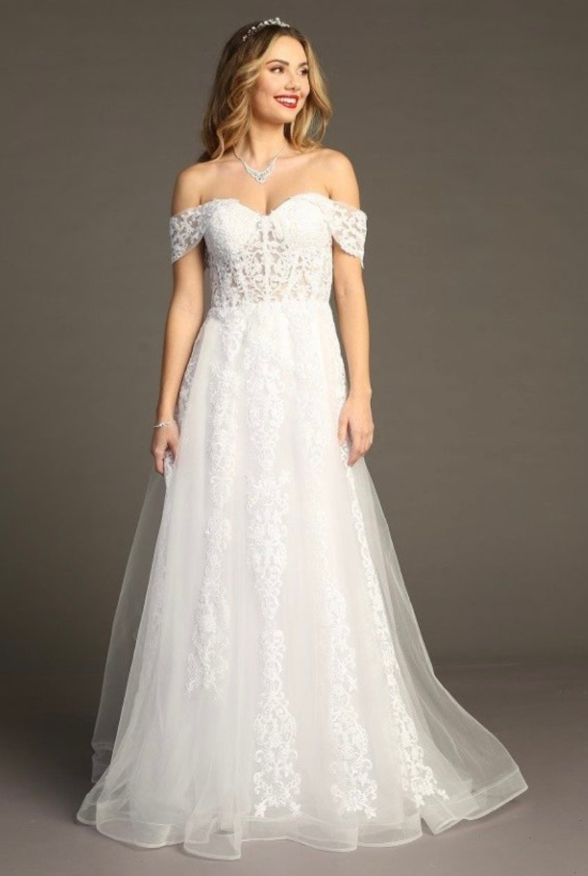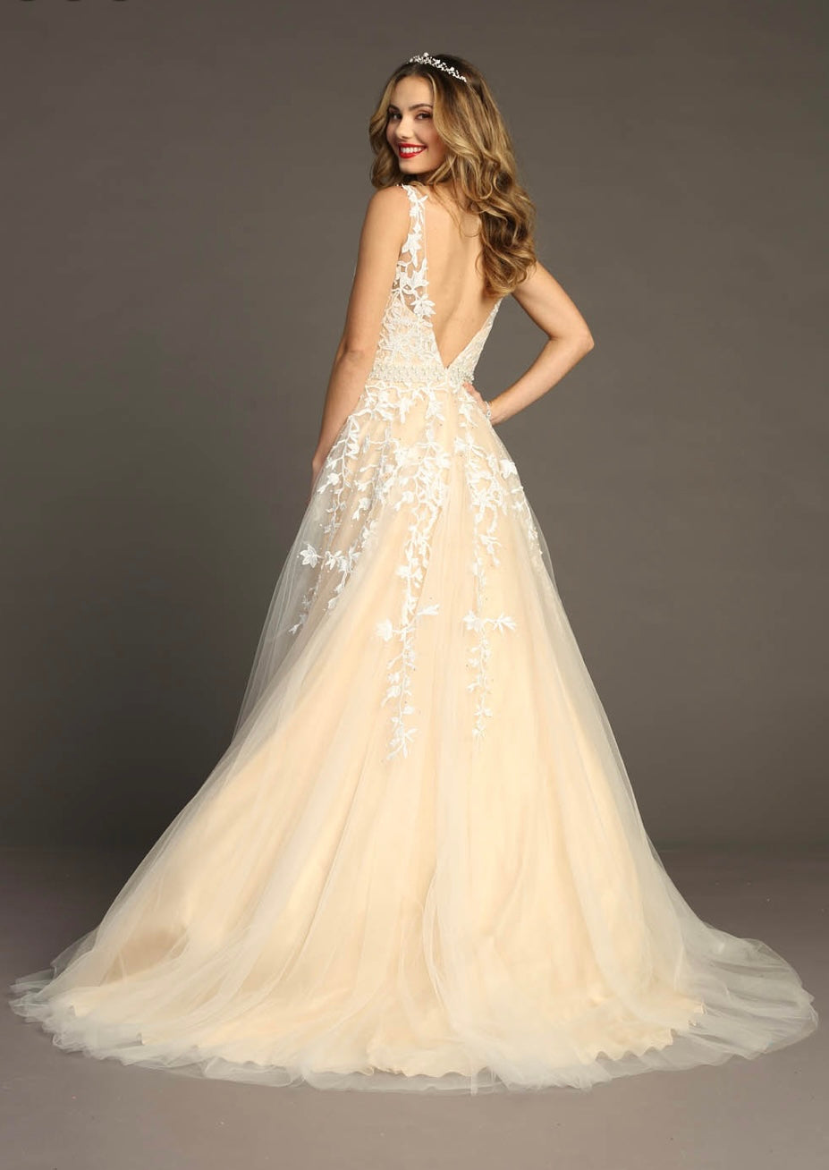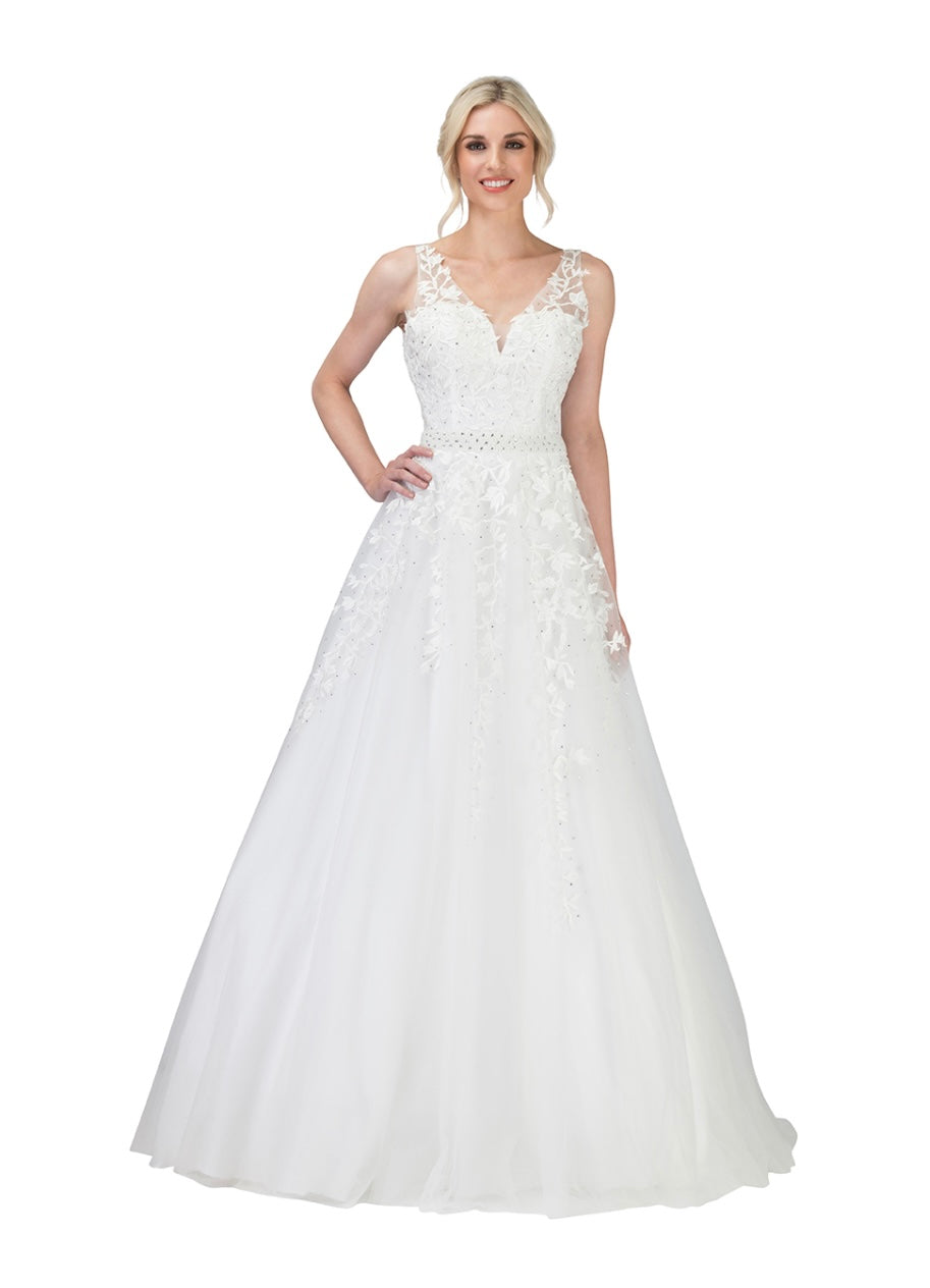 This elegant A-line gown features a deep illusion V-neckline with delicate shoulder straps and a beaded waistband that defines the silhouette. The bodice is adorned with intricate floral lace appliqués that gracefully cascade down the soft tulle skirt, adding a romantic and feminine touch. Available in classic ivory and a soft nude base with white embroidery, this dress is perfect for modern brides or formal occasions.