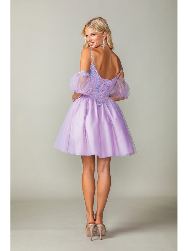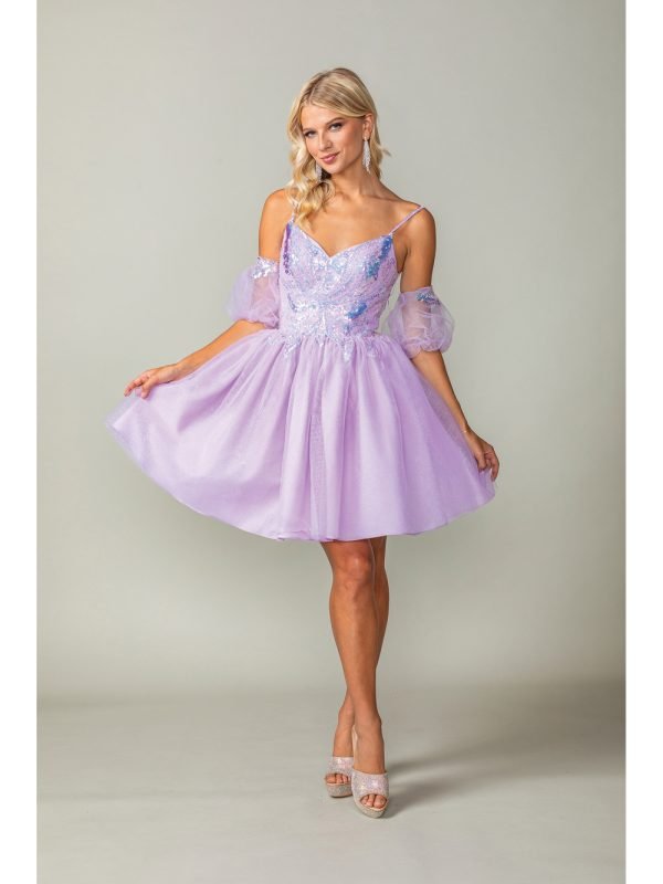 The Dancing Queen Evening Gowns 3362 is a charming short formal dress perfect for semi-formal events, homecoming, or sweet sixteen celebrations. It features a flattering fitted bodice adorned with delicate appliqué and beading for a touch of elegance. The playful puff sleeves add a whimsical and romantic flair, while the flared A-line skirt brings youthful energy and graceful movement. Designed to make you feel confident and radiant, this dress blends style and sweetness effortlessly.