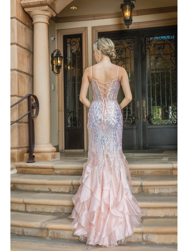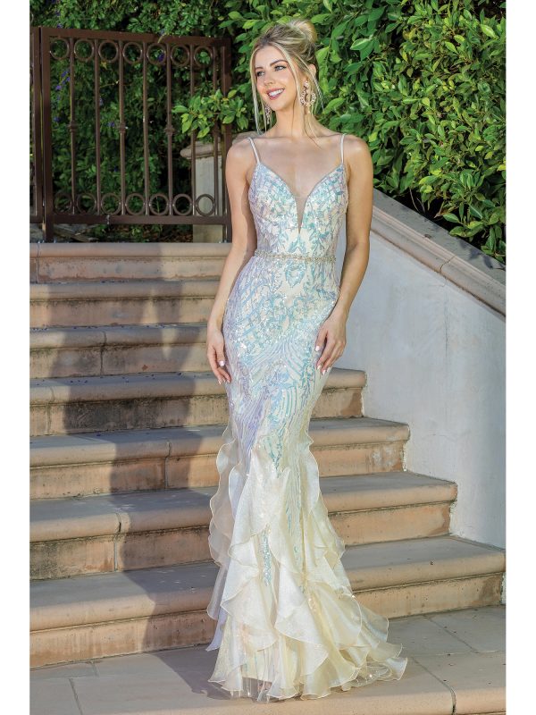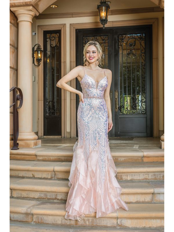 Elevate your evening look with the stunning Dancing Queen 4224 gown. This breathtaking piece showcases a form-fitting silhouette with a deep V-neckline and slender spaghetti straps for a modern, elegant appeal. The bodice is adorned with dazzling sequins and intricate beadwork that continue down the entire length of the dress, catching the light with every move. The figure-hugging design flares slightly at the hem to create a graceful finish, perfect for proms, galas, or any special occasion where glamour is a must.