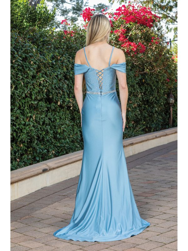 Turn heads in the Dancing Queen 4292 satin mermaid gown, a stunning choice for prom or any formal occasion. Crafted from sleek satin fabric, this gown features elegant off-the-shoulder straps that frame the neckline beautifully. The fitted bodice flows into a dramatic mermaid silhouette, accentuating your curves with timeless sophistication. A crisscross lace-up back adds a striking and adjustable detail, ensuring a perfect fit while enhancing the gown’s allure. Sophisticated and sultry, this gown is made for unforgettable entrances.