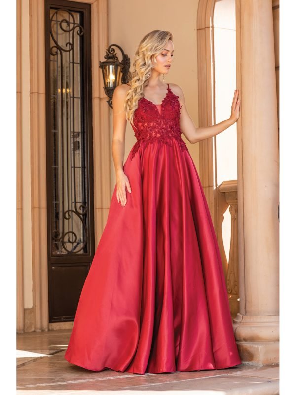 Radiate elegance and timeless beauty in the Dancing Queen 4326 evening gown, available in a variety of stunning colors. This full-length A-line gown features a delicate spaghetti strap bodice adorned with intricate floral lace appliqués, adding a touch of romance and femininity. The plunging neckline is both flattering and graceful, while the structured satin skirt flows effortlessly to the floor, creating a classic and sophisticated silhouette. Perfect for prom, pageants, or any formal event where you want to make a lasting impression.