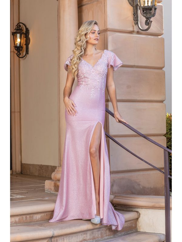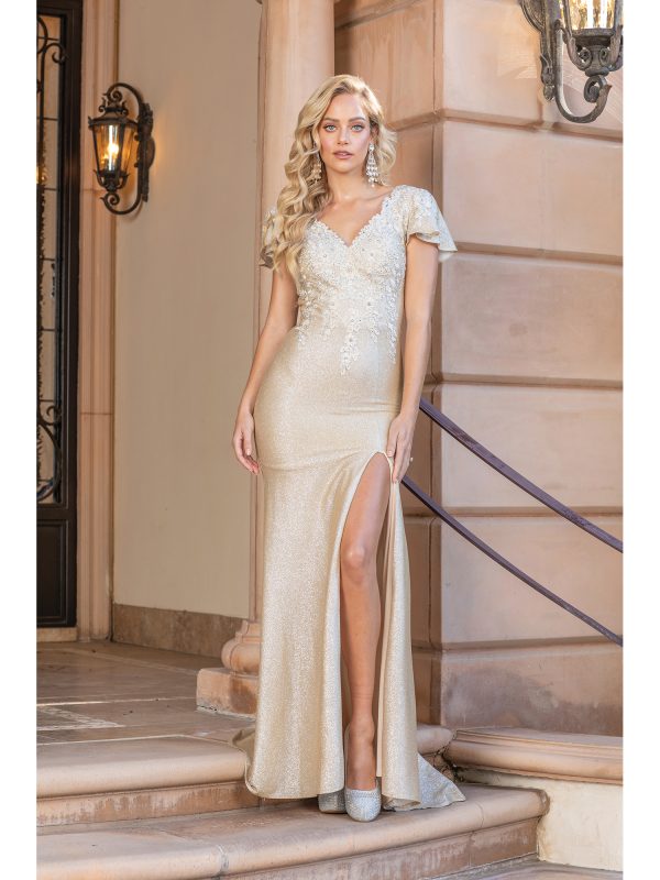 Make a grand entrance in the timeless elegance of the Dancing Queen 4330 evening gown. This stunning glitter gown is designed with a graceful A-line silhouette and features beautifully embellished cap sleeves for a touch of regal sophistication. The V-neckline complements the delicately fitted bodice, while the deep V-back adds a modern and alluring twist. Crafted with shimmering glitter fabric, this gown ensures you’ll sparkle with every step—perfect for prom, formal galas, or special occasions.