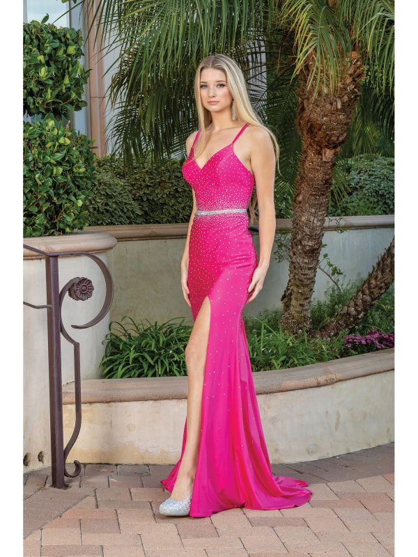Dazzle the night away in the sophisticated elegance of Dancing Queen 4270. This glamorous evening gown features an off-the-shoulder neckline that gracefully highlights the shoulders and collarbone. The fitted bodice is beautifully adorned with intricate lace embroidery and delicate floral appliqués, adding texture and elegance. The gown hugs the curves before flowing into a fitted skirt with a thigh-high slit for a modern and alluring finish. Perfect for prom, pageants, galas, or formal occasions, this design radiates confidence and timeless beauty.