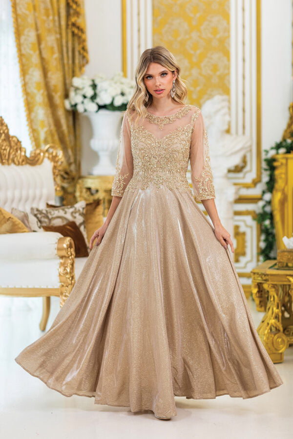A-Line Prom Dress with Beaded Lace Bodice and Sheer Long Sleeves