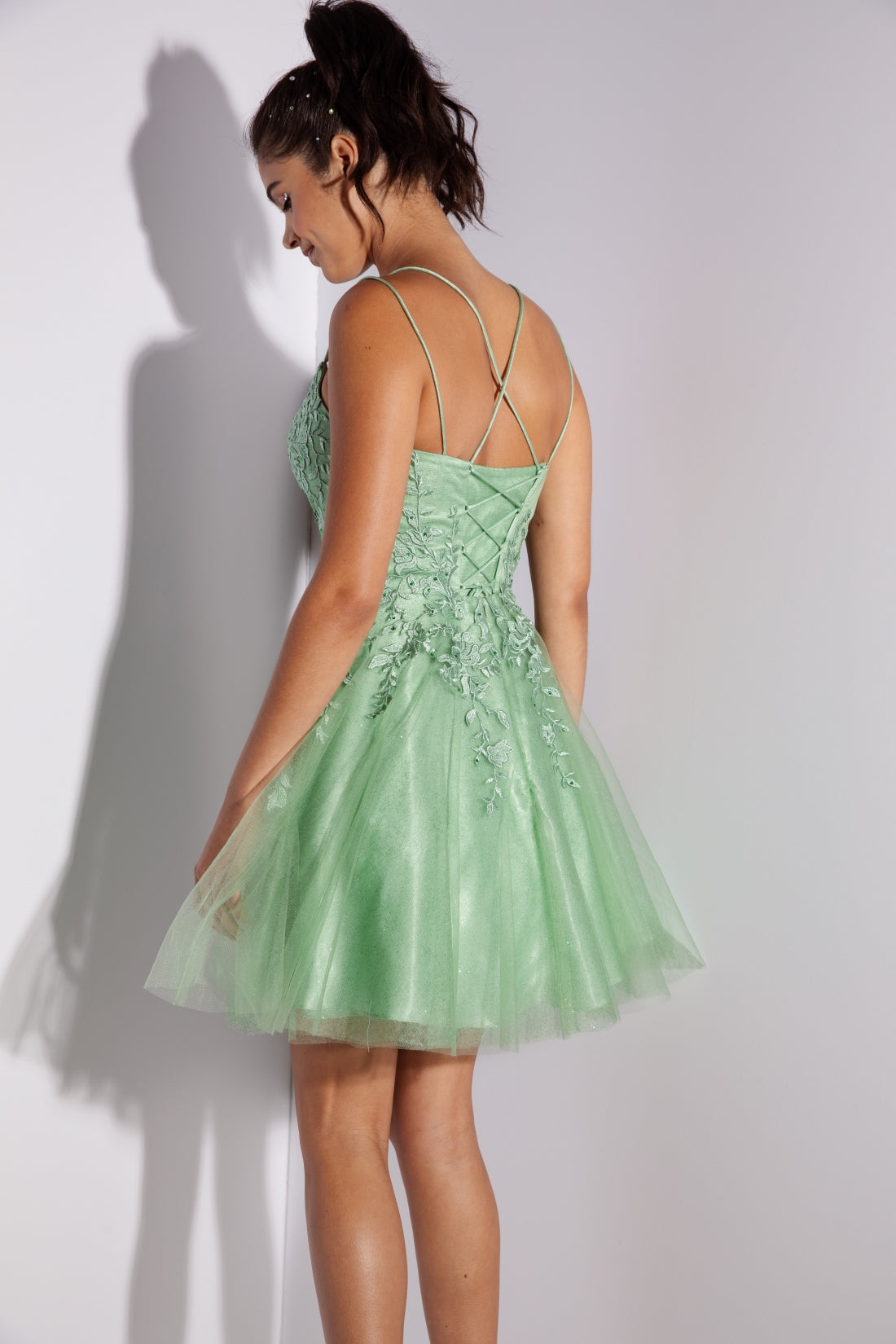 Fun and flirty, this short A-line dress features a straight neckline with double spaghetti straps and a fitted bodice richly embellished with floral embroidery and shimmering sequins. The playful tulle skirt flares out in soft layers, adding bounce and charm to every step. Perfect for homecoming, cocktail parties, or semi-formal events where you want to shine with elegance and energy. Available in red, teal, black, mint, white, and yellow.