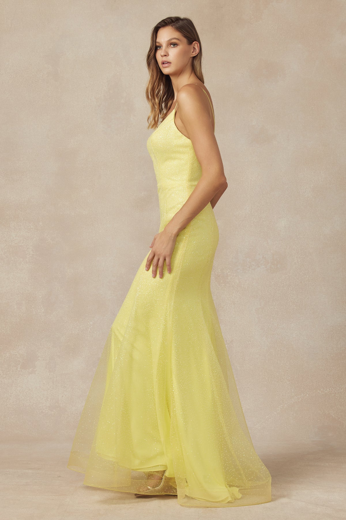 The Juliet Evening Gown JT271 exhibits a sleek and form-fitting silhouette that combines glamour with refined elegance. The design highlights a plunging V-neckline supported by slender straps, leading into a fitted bodice that shapes and flatters the waist. From there, the gown extends into a mermaid skirt that hugs the hips and then gently flares toward the hem, creating a dramatic and flattering profile. A low open back with delicate strappy detailing adds an alluring touch, and a concealed zipper closure maintains a smooth, polished finish. The fabric itself includes glitter mesh overlay, lending a subtle shimmer and radiant dimension to the gown.