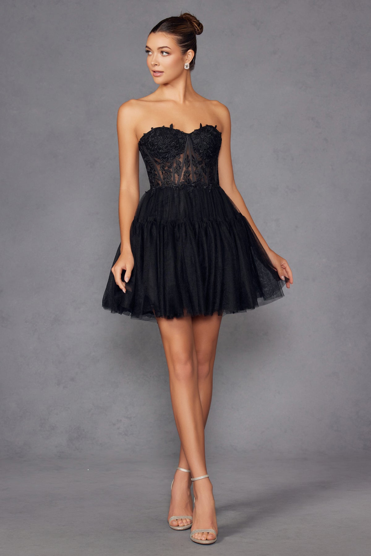 The Juliet Evening Gown JT2488S is a captivating design that blends romantic elegance with a touch of drama. This strapless gown features a sheer corset-style bodice adorned with intricate lace detailing, offering both structure and femininity. The high-low layered tulle skirt adds a dynamic effect, allowing for graceful movement while showcasing a modern twist on a classic silhouette. Perfect for galas, prom nights, or evening celebrations, this gown is designed to make a lasting impression.
