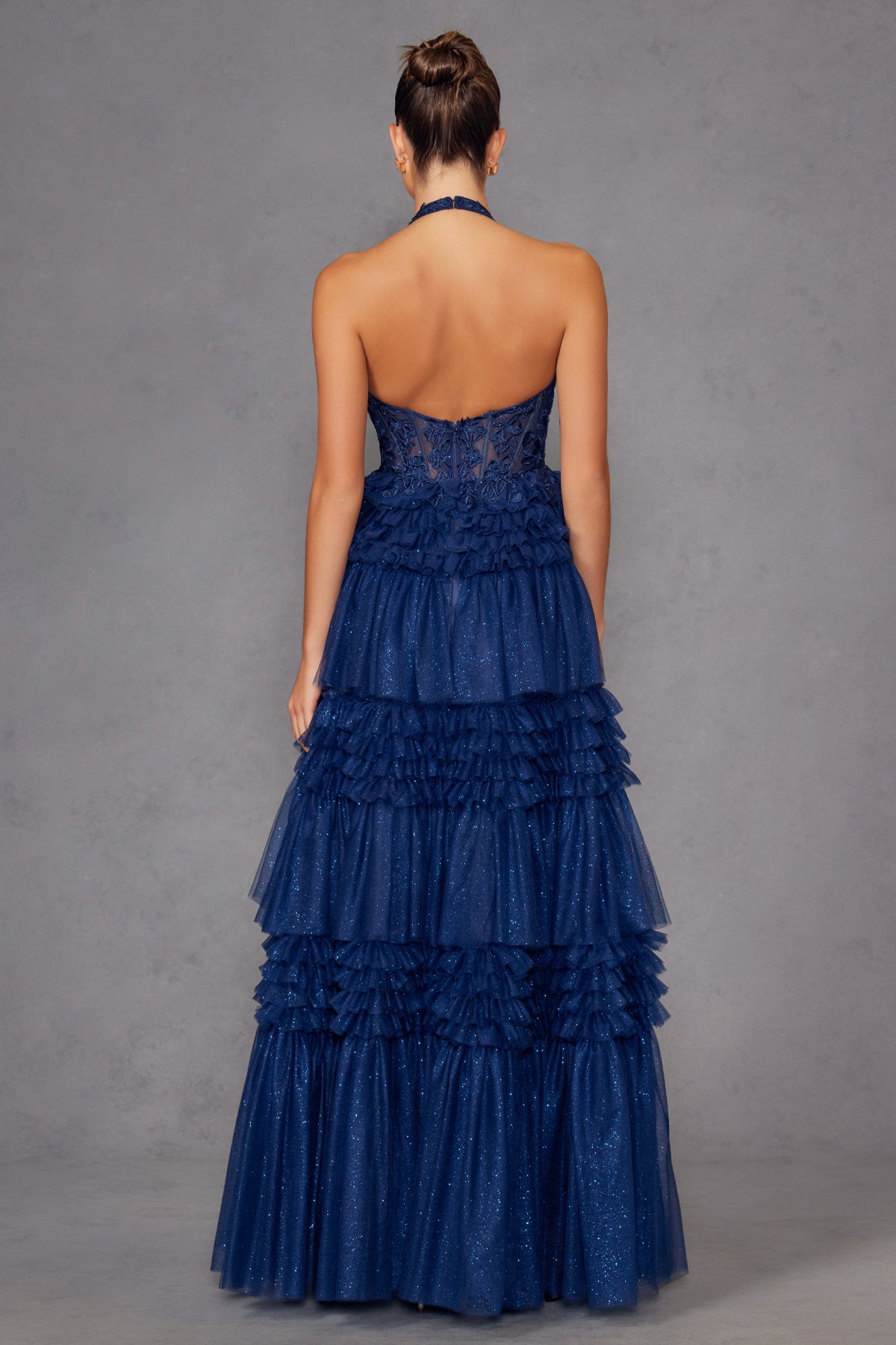 This elegant gown is crafted to turn heads. It features a plunging V-neckline supported by halter straps that lead into an open back, creating a graceful, elongating silhouette. The bodice includes illusion mesh and subtle lace floral accents for a touch of delicate femininity. The skirt flows in a layered, tiered A-line cut, with ruffled tiers that cascade down, and it incorporates a thigh-high side slit for movement and flair. The gown is fully lined and includes built-in cups for support.