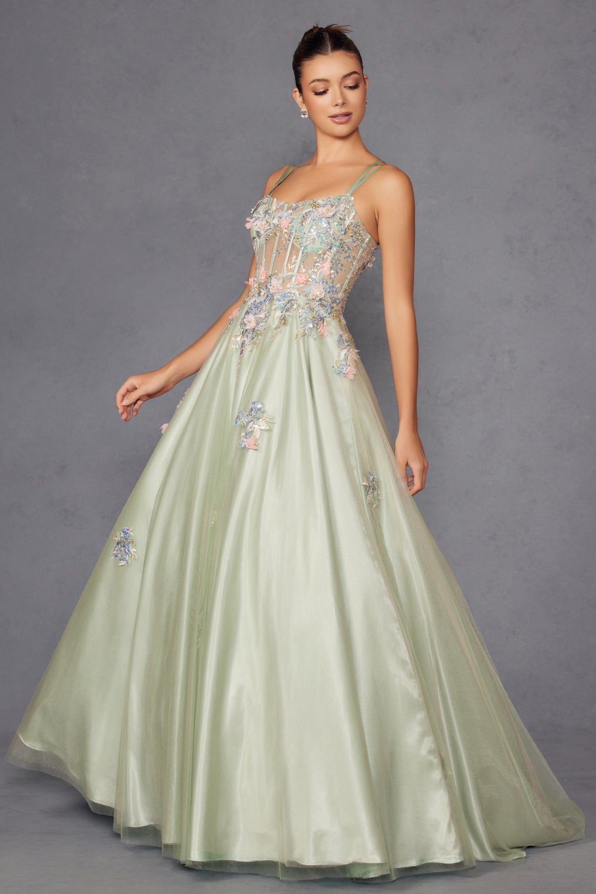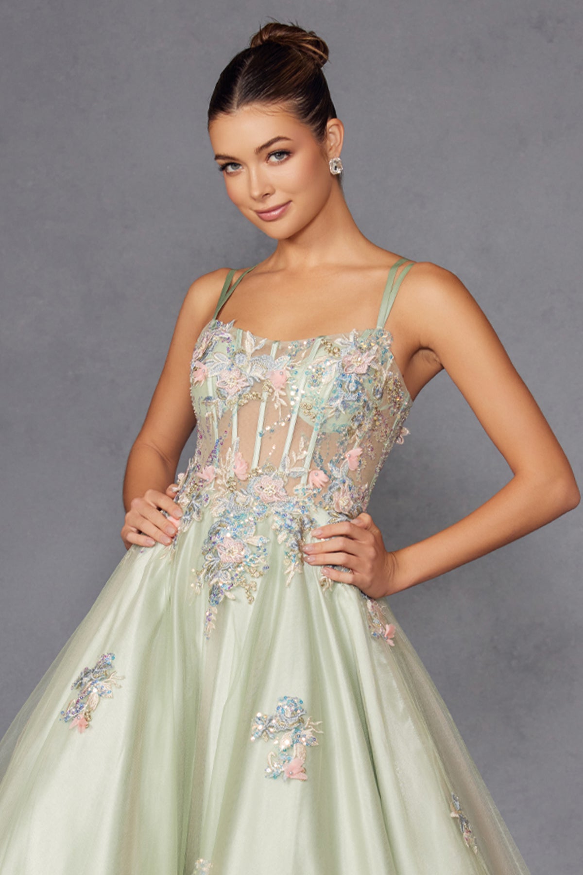 The Juliet Evening Gown JT2565U is a captivating choice for formal occasions. It features a sleeveless illusion scoop neckline adorned with delicate floral appliqués, adding a touch of elegance to the design. The bodice is structured with corset boning, providing both support and a flattering silhouette. Thin spaghetti straps complement the neckline, leading to an open lace-up back with a zipper closure, allowing for an adjustable and secure fit. The gown flows into a floor-length A-line skirt with a sweep train, creating a graceful and timeless look. Crafted from soft tulle and embroidery, this dress is fully lined and includes built-in bra cups for added comfort. Its classic design makes it suitable for various formal events, ensuring the wearer feels both beautiful and confident.