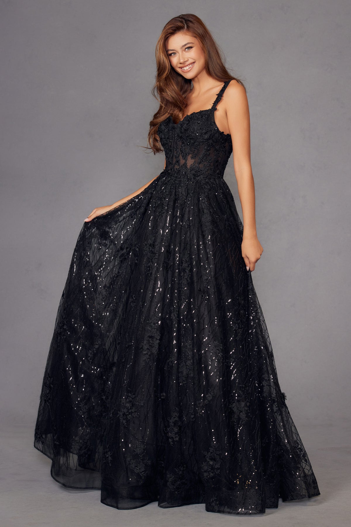 The Juliet Evening Gown JT2495A is a sophisticated and romantic choice for formal occasions. It features a sleeveless illusion sweetheart bodice with thin straps and corset boning, providing a flattering and structured fit. The gown showcases intricate lace appliqués, embroidery, and beaded embellishments, adding a touch of elegance and sparkle. The open lace-up back with a zipper closure ensures a secure and customizable fit. The floor-length A-line skirt flows gracefully with a sweep train, creating a regal silhouette. Crafted from tulle, embroidery, lace appliqués, beaded embellishments, and polyester, this gown is fully lined and includes bra cups for added comfort.