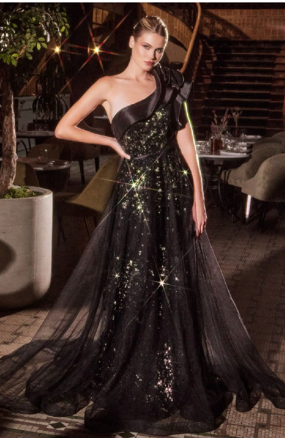 This breathtaking ball gown showcases an asymmetrical one-shoulder design adorned with a satin rosette and shimmering gold glitter detailing for a touch of opulence. Crafted with layered tulle and a structured bodice, it offers elegant support while the flowy A-line skirt moves gracefully with every step. Perfect for mothers of the bride, formal gatherings, or black-tie events, this gown embodies timeless sophistication and charm.
