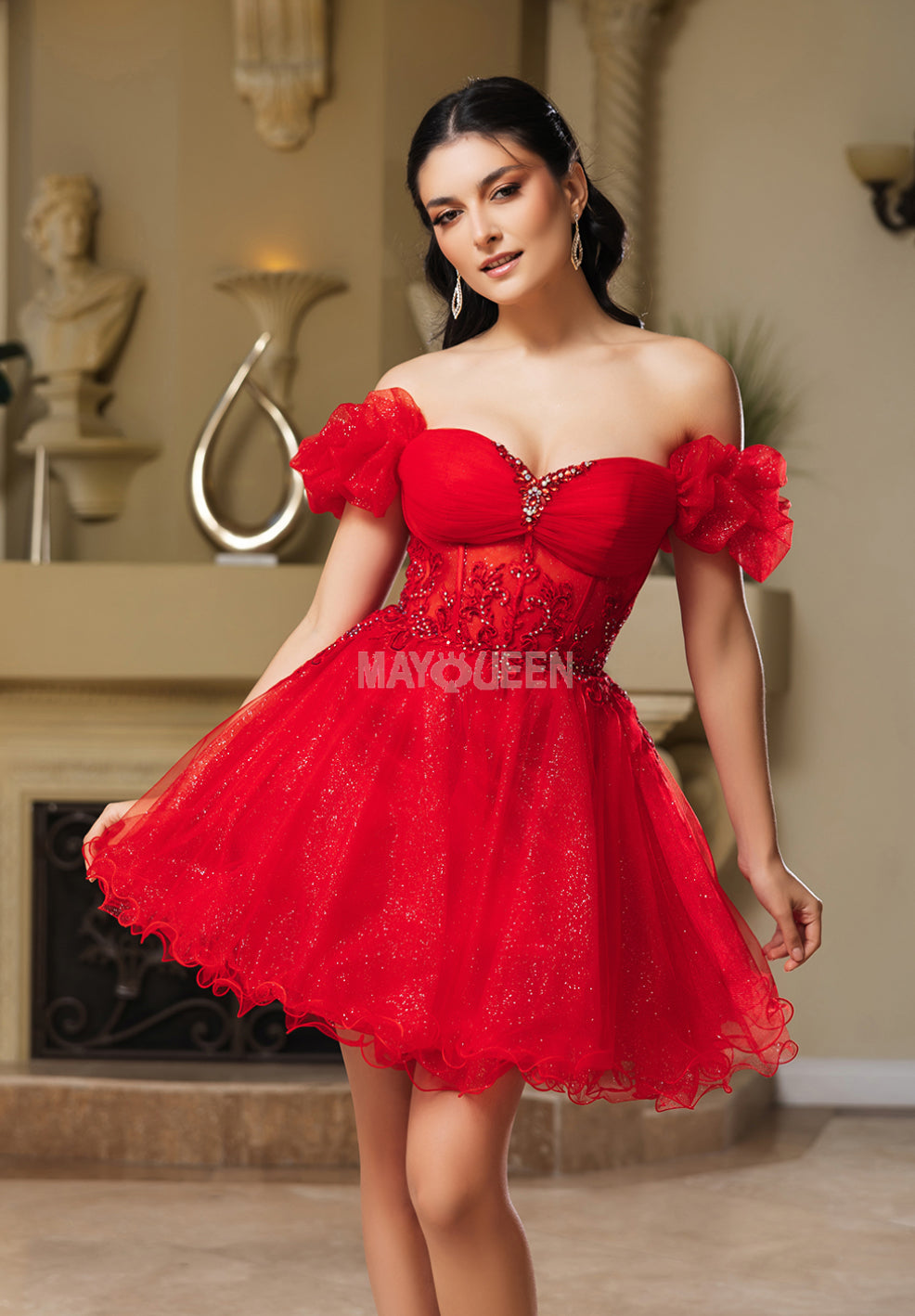 The MayQueen Cocktail Dress MQ2164 is a charming and romantic choice for semi-formal occasions. This short A-line dress features an illusion corset bodice adorned with intricate floral beaded embroidery, adding a touch of elegance. The off-shoulder puff sleeves introduce a whimsical and youthful flair, while the ruffled hemline enhances its playful and feminine silhouette. Designed to evoke a fairytale-inspired charm, this dress is perfect for cocktail parties and special gatherings where style and sophistication meet.