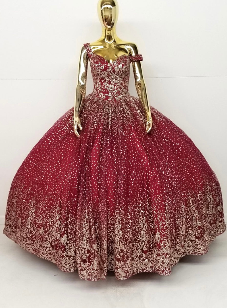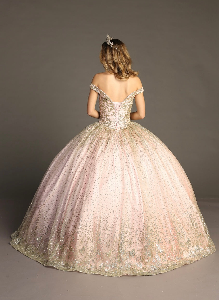 Make a regal entrance in this breathtaking off-the-shoulder quinceañera ball gown. The fitted bodice features a romantic sweetheart neckline, adorned with shimmering metallic embroidery and dazzling glitter embellishments that cascade beautifully into the voluminous skirt. The ombré glitter pattern adds a luxurious dimension, making this gown sparkle from every angle. Available in captivating shades such as blush, wine, and champagne, this dress embodies fairy-tale elegance and is perfect for making unforgettable memories.