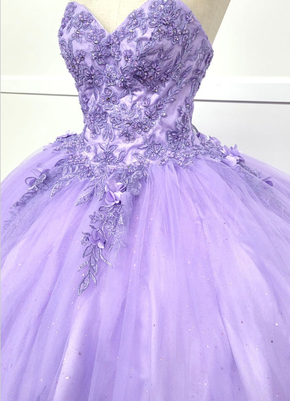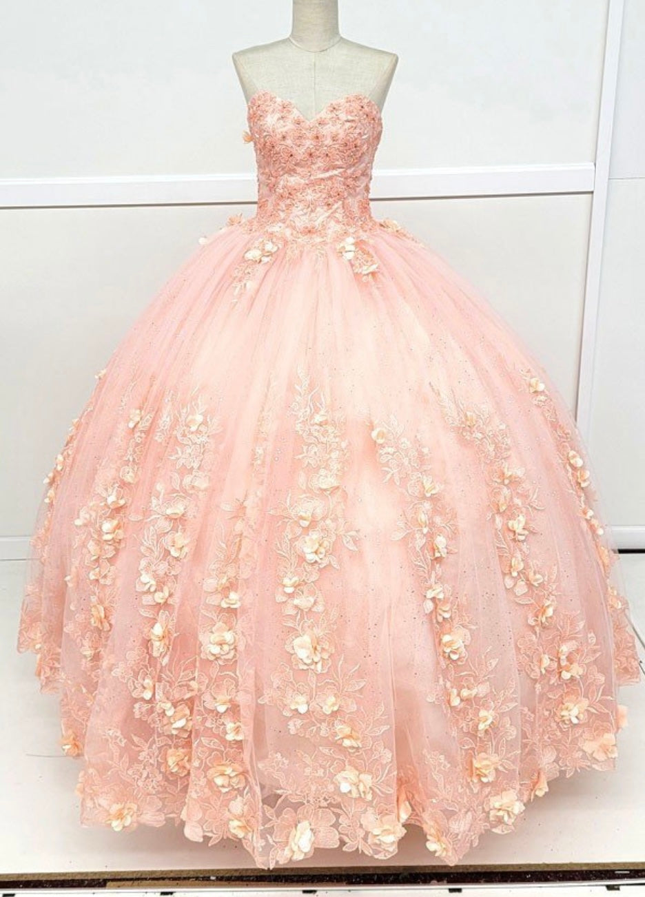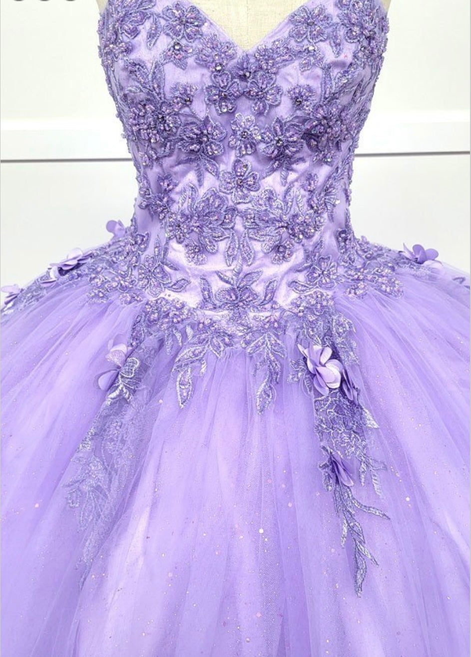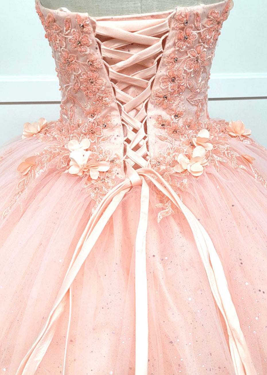 Turn your quinceañera dreams into reality with the Chicas gown style CHF3035. This enchanting strapless ball gown features a sweetheart neckline and a structured bodice adorned with delicate floral appliqués and subtle glitter accents. The voluminous tulle skirt is embellished with cascading 3D flowers and embroidered lace, creating a magical garden effect. Romantic and regal, this dress is perfect for a princess moment.