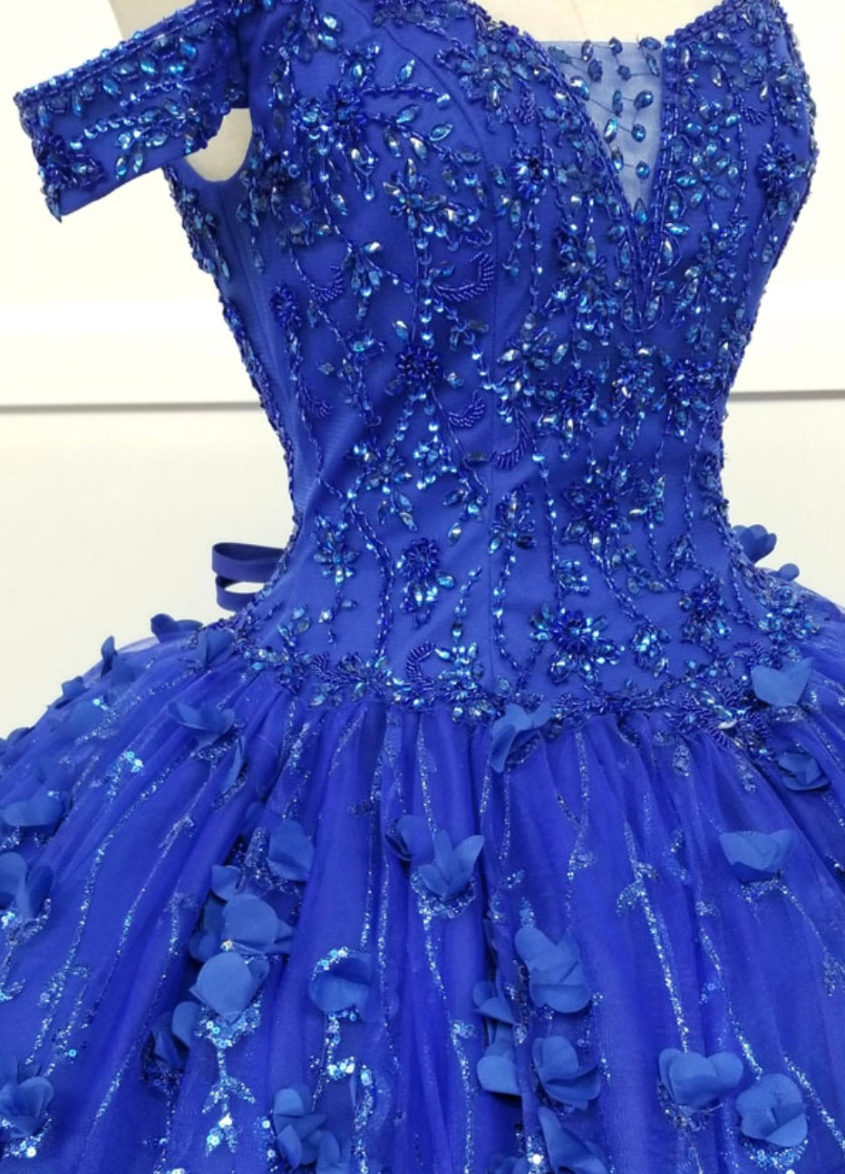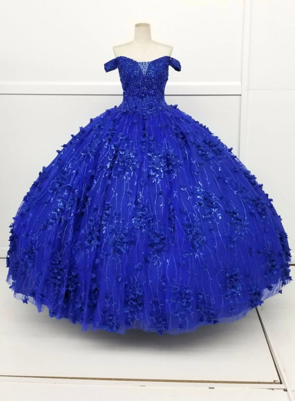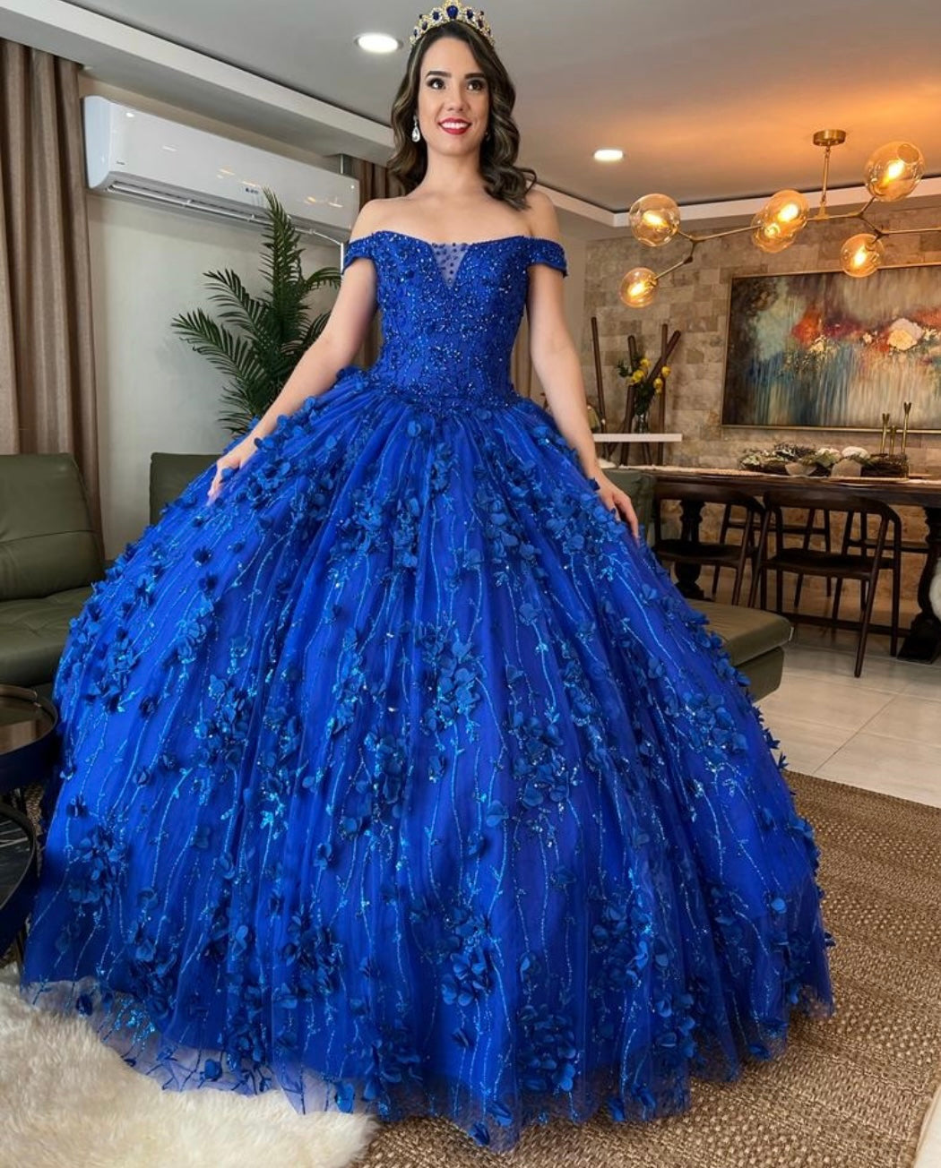 Make a grand entrance in this breathtaking off-the-shoulder ball gown by Chicas, style CHF3038. This dress features a sweetheart neckline and a fully embellished bodice adorned with sparkling beads and floral appliqués. The voluminous tulle skirt is beautifully decorated with cascading 3D floral details and shimmering vine-like embroidery, adding movement and elegance. Perfect for quinceañeras or any regal celebration, this gown is available in stunning colors like royal blue. A true fairytale piece for an unforgettable moment.