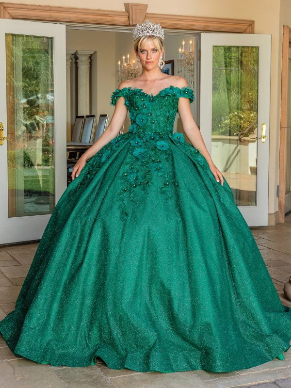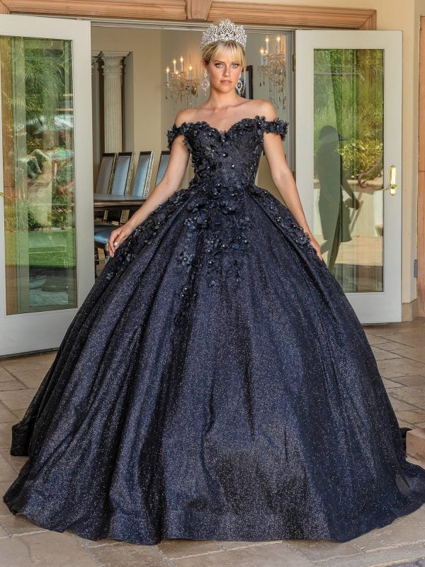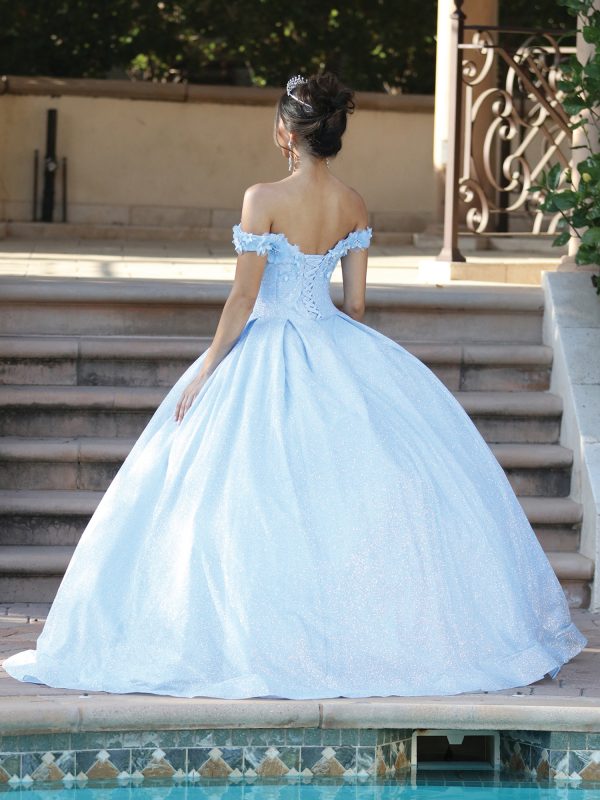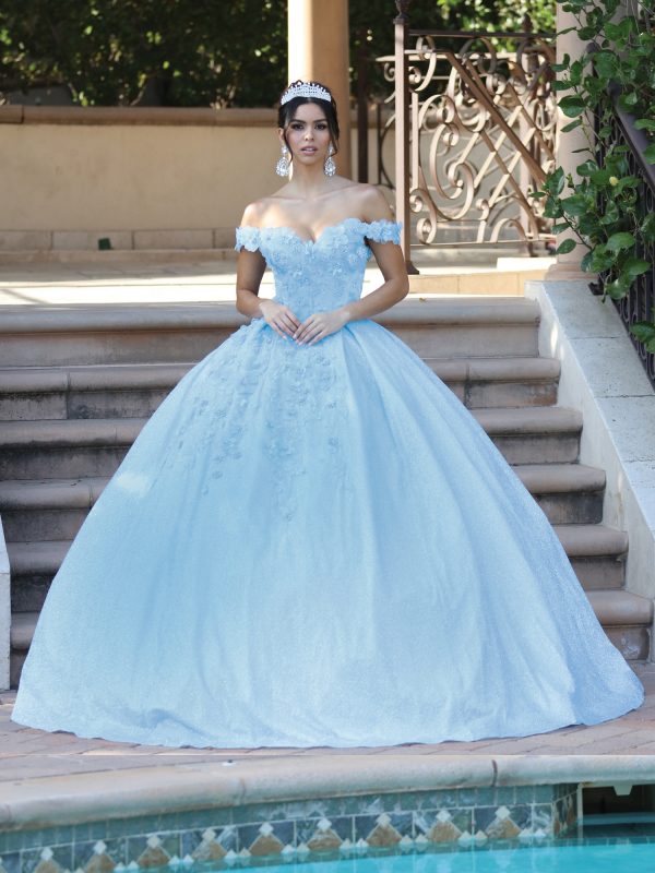 Celebrate your milestone in royal style with the Dancing Queen Quinceañera Dress 1527. This elegant off-the-shoulder ball gown features a delicately embellished bodice with intricate embroidery and sparkling details that bring the perfect touch of glamour. The full skirt cascades in layers of soft tulle, adorned with ornate appliqués that create dimension and movement. A lace-up corset back ensures a secure and adjustable fit, sculpting a flattering silhouette while offering all-day comfort. Designed to captivate from every angle, this gown is ideal for creating an unforgettable quinceañera moment.