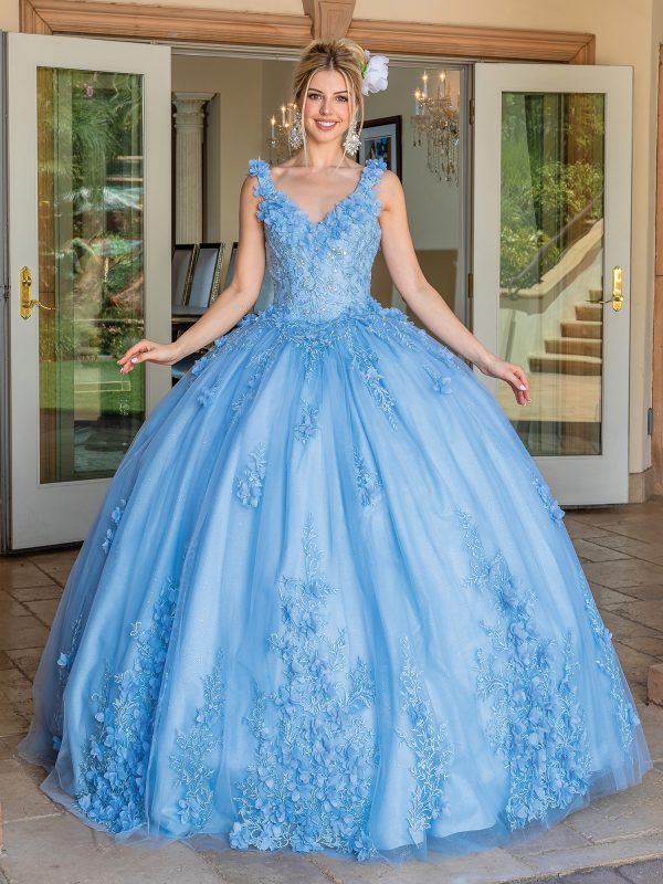 Grace your special day with elegance in the Dancing Queen Quinceañera Dress 1623. This stunning ball gown features an off-shoulder neckline and a structured bodice adorned with intricate embroidery and shimmering embellishments that add a regal touch. The voluminous skirt flows in layers of soft tulle, enhanced with delicate appliqués that bring movement and dimension to the silhouette. A lace-up corset back provides a secure, adjustable fit, ensuring comfort and a flawless shape throughout your celebration. Designed to capture attention, this gown is perfect for your unforgettable quinceañera moment.