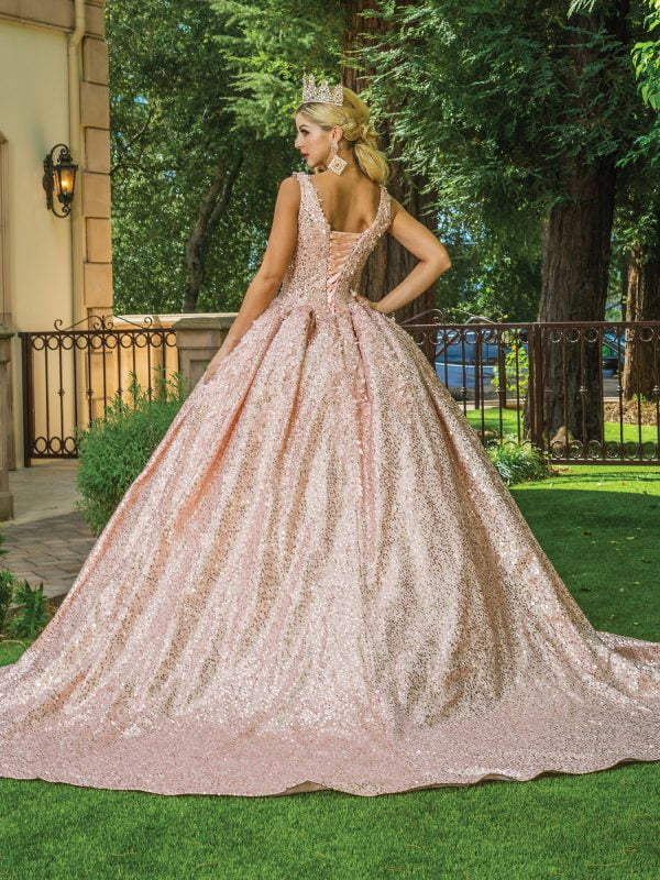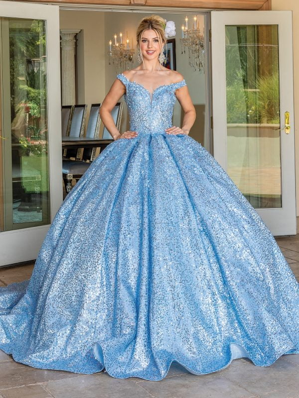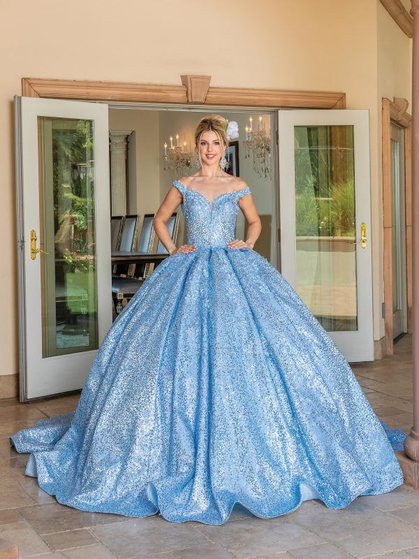 Turn your special day into a fairytale with the Dancing Queen Quinceañera Dress 1624. This stunning off-shoulder ball gown features a beautifully structured bodice adorned with glitter embellishments and intricate sequin lace appliqués that shimmer with every movement. The full skirt flows elegantly into a dramatic court train, adding a regal and graceful finish to the silhouette. Designed for a striking presence, the gown combines luxurious detail with timeless charm. A lace-up corset back ensures a customizable and flattering fit, making it the perfect choice for an unforgettable quinceañera celebration.