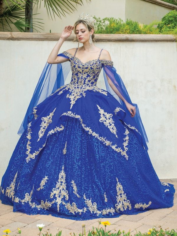 Step into your fairytale moment with the enchanting elegance of the Dancing Queen Quinceañera Dress 1638. This gorgeous gown features an off-shoulder neckline and a beautifully embellished bodice, showcasing intricate embroidery and sparkling details that add a regal touch. The full ball gown skirt flows gracefully in layers of soft tulle, enhanced with ornate appliqués that create a captivating, dimensional look. A lace-up corset back ensures a snug, adjustable fit for maximum comfort and style. Perfect for a show-stopping entrance, this gown is designed to make your quinceañera celebration unforgettable.