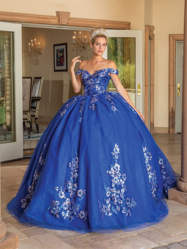 Step into your celebration with grace and grandeur in the Dancing Queen Quinceañera Dress 1737. This elegant gown features an off-shoulder neckline with a structured, intricately adorned bodice that showcases luxurious detailing and sparkling embellishments. The full ball gown skirt flows in layers of soft tulle, enhanced with beautiful embroidery and appliqués that add depth and sophistication. A lace-up corset back allows for a personalized fit, ensuring comfort and confidence throughout your special day. Designed to captivate from every angle, this gown is the perfect choice for a truly regal entrance.