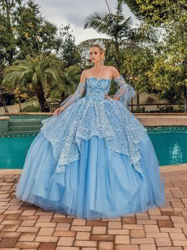 Experience elegance and sophistication in the Dancing Queen Quinceañera Dress 1773. This exquisite gown features a strapless sweetheart neckline with an intricately embellished bodice that enhances its regal appeal. The voluminous ball gown skirt is crafted with layers of delicate fabric and adorned with detailed appliqués that create a stunning texture and graceful movement. A lace-up corset back provides a secure and adjustable fit, ensuring comfort throughout your special day. Perfect for making a memorable entrance, this dress embodies timeless beauty and refined craftsmanship.