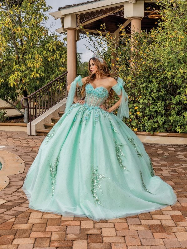 Make your grand celebration truly unforgettable with the Dancing Queen Quinceañera Dress 1813. This enchanting gown showcases a strapless, sweetheart neckline bodice that’s richly adorned with intricate beading and embroidery, creating a luxurious and regal look. The voluminous ball gown skirt features delicate layers and ornate appliqués that flow gracefully with every step. A lace-up corset back ensures a comfortable, secure fit while adding a classic touch of elegance. Designed for the modern princess, this gown is perfect for making a lasting impression on your special day.