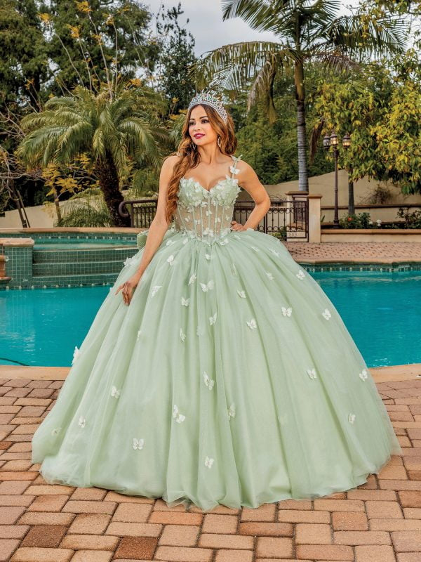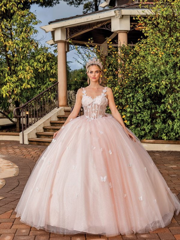 Make a breathtaking entrance in the Dancing Queen Quinceañera Dress 1879. This stunning ball gown features a beautifully structured corset bodice adorned with intricate embroidery and sparkling embellishments that add a touch of regal elegance. The off-shoulder neckline is complemented by delicate floral appliqués, enhancing the romantic appeal. A voluminous tulle skirt flows dramatically from the waist, creating a timeless and majestic silhouette. Perfect for making unforgettable memories on your special day, this gown is a celebration of grace, beauty, and tradition.