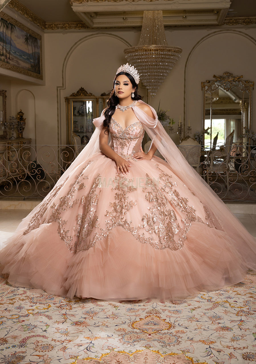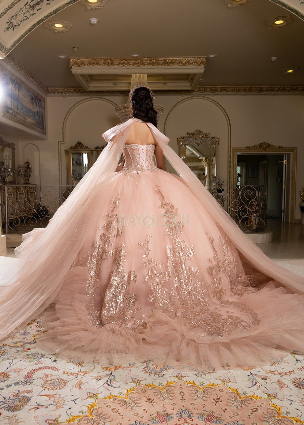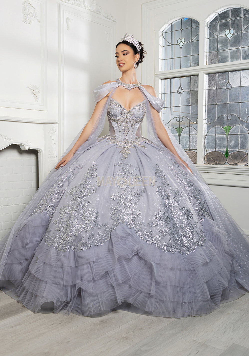 The MayQueen LK284 is a captivating ball gown designed to make your quinceañera unforgettable. This gown features a strapless sweetheart neckline with a beaded corset bodice, adorned with cascading glitter appliqué that adds a touch of sparkle and elegance. The voluminous skirt is enhanced by pleated petal-like ruffles at the hem, creating a dramatic and feminine silhouette. For added sophistication, the dress includes a removable off-the-shoulder cape, perfect for a grand entrance.Crafted with meticulous attention to detail, the LK284 combines classic design elements with modern embellishments, ensuring you feel like royalty on your special day.