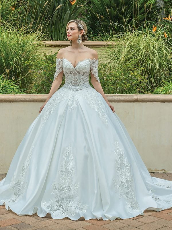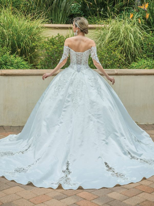 Dancing Queen Wedding Gown 0187 is a breathtaking bridal dress designed to make your special day truly unforgettable. This gown features an elegant off-shoulder neckline with a fitted bodice adorned in intricate lace and shimmering embellishments that add a touch of sparkle to every step. The voluminous ball gown skirt flows beautifully into a sweeping train, crafted from layers of soft tulle for a romantic and ethereal look. Delicate floral appliqués cascade throughout the gown, enhancing its fairytale charm. Perfect for brides seeking a classic yet modern silhouette, this dress offers timeless beauty and a flattering fit for a stunning bridal entrance.
