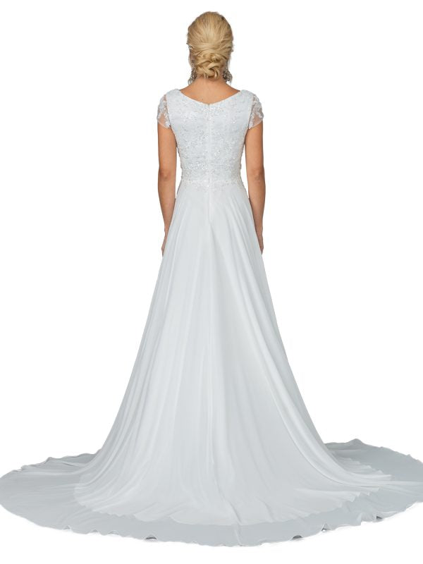 Make your special day unforgettable with the timeless elegance of the Dancing Queen Wedding Gown 0190. This exquisite gown features a stunning A-line silhouette that flatters all body types, creating a romantic and graceful look. The bodice is adorned with intricate lace appliqués and delicate beadwork, adding a touch of sparkle and sophistication. A sweetheart neckline enhances the feminine charm, while the sheer illusion details on the back provide a modern twist. The flowing tulle skirt cascades beautifully to the floor, making every step feel like a dream. Whether you’re walking down the aisle or dancing the night away, this gown is designed to make you feel like royalty.