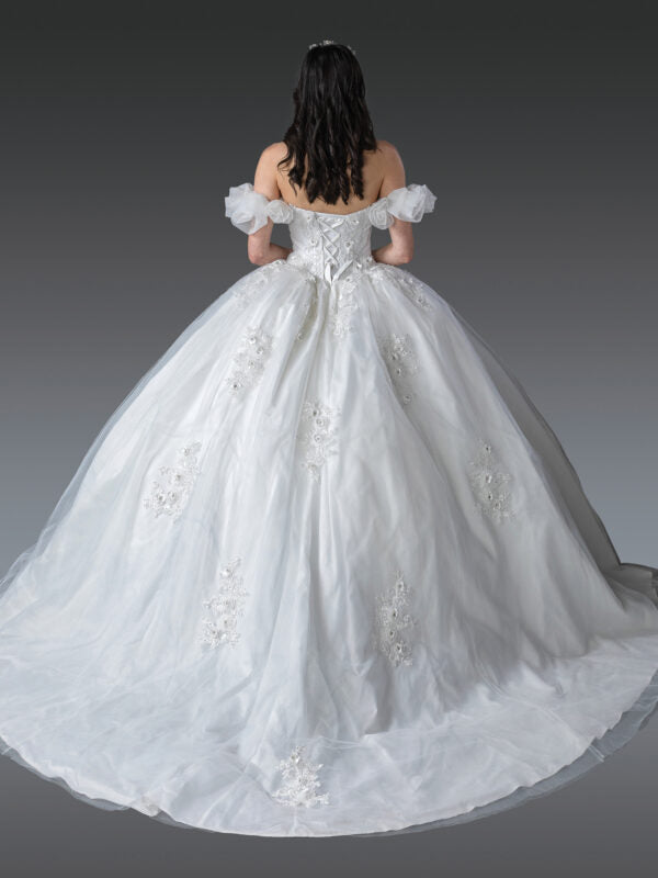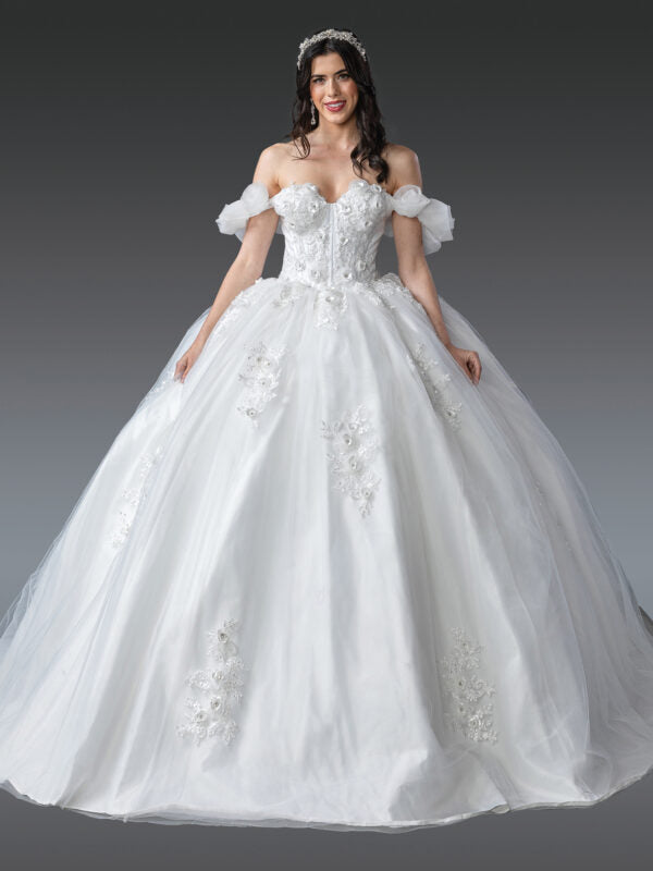 Make an unforgettable entrance in the stunning Dancing Queen Wedding Gown 0278. This breathtaking design features an off-the-shoulder neckline with elegant draped sleeves that add a romantic touch. The structured bodice is adorned with intricate lace and beadwork, offering both support and dazzling detail. A fitted silhouette flows into a graceful skirt with a high slit, combining timeless bridal beauty with a modern, confident edge. This gown is perfect for brides who want to showcase their style while embracing classic bridal elegance.